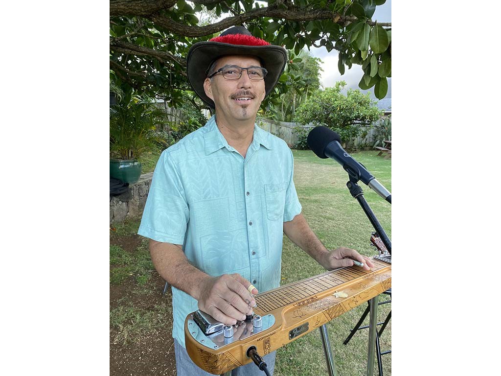 Featured steel guitarist Pauil Kim. Note the carving detail on Pauil's steel, his personal trademark. Photo by Alan Akaka.