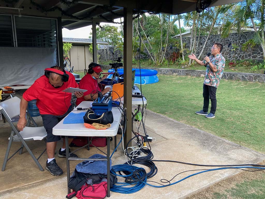Alan's welcome is monitored by Video Engineer Scotty Wong and Sound Engineer Anthony Narito. Photo by Alan Akaka.