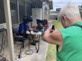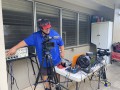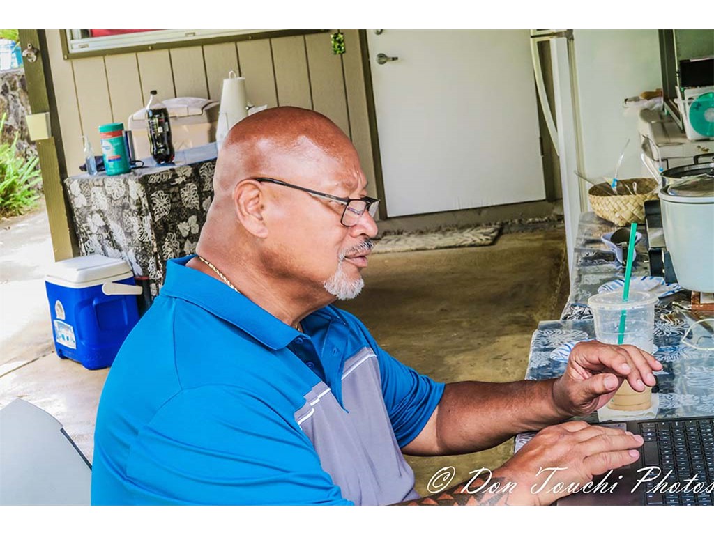 Larry Holu monitoring the Facebook live stream. Additional monitoring, and commentary were done remotely in Kona by Natan Goore and in California by Addison Ching.