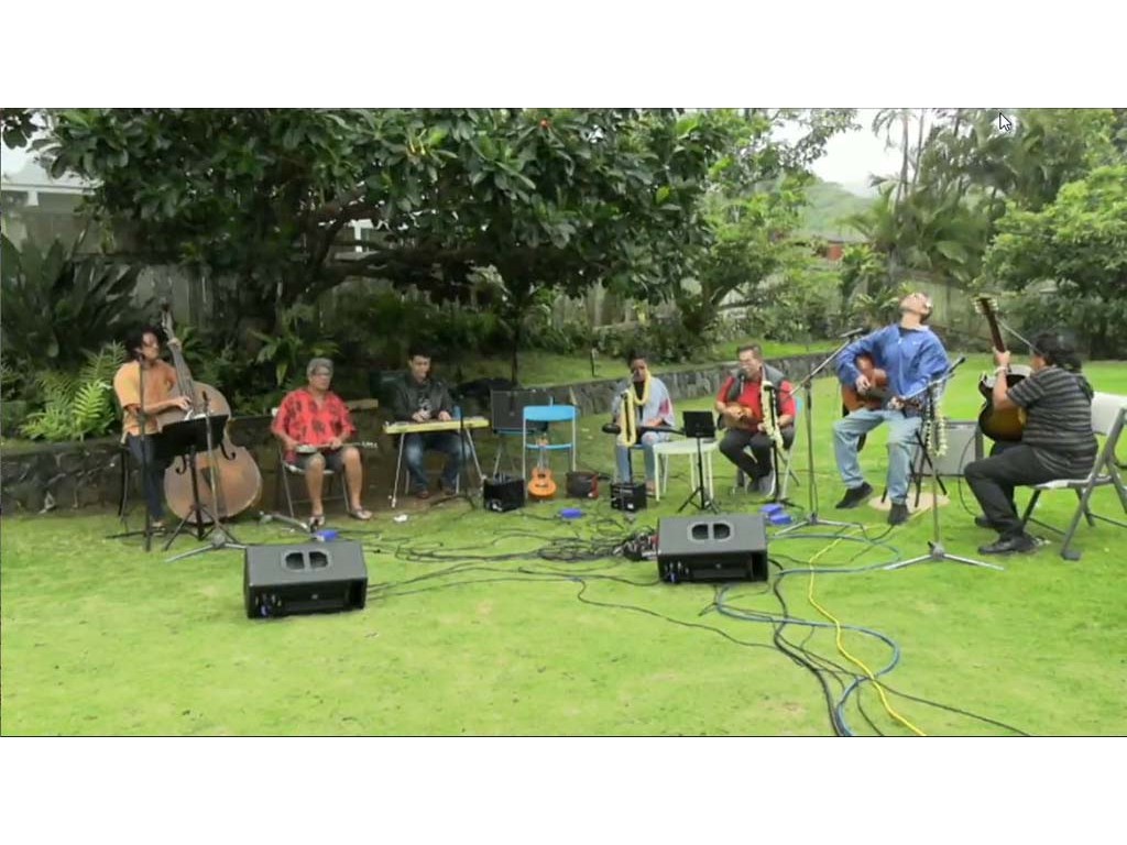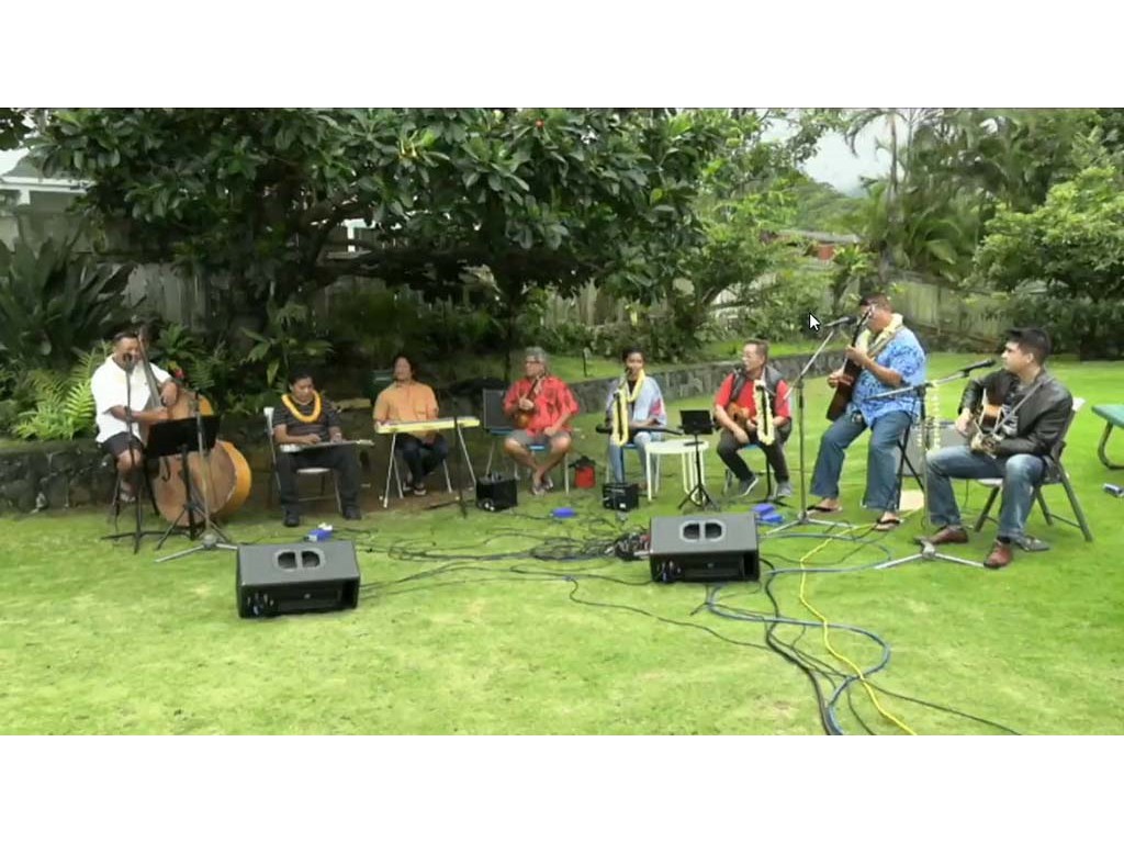 The musicians switched instruments. From left: Jeff Au Hoy on bass, Greg Sardinha on steel guitar, Kapono Lopes on steel guitar, Mālie Lyman, Alan Akaka, Pono Kalaʻi, and Bobby Ingano on guitar.