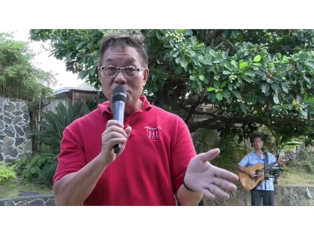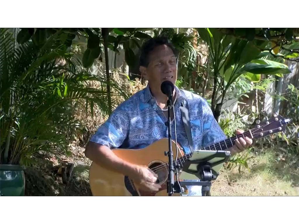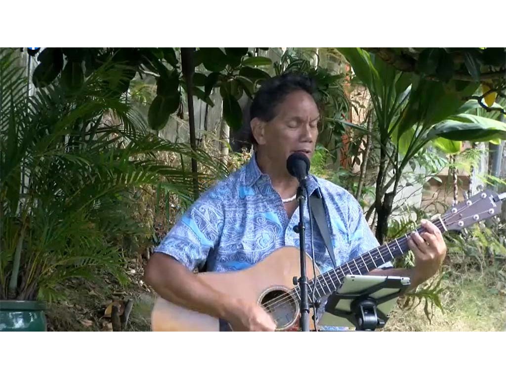 Emcee Alan Akaka announcing future livestream showcases on Kauaʻi and Maui.