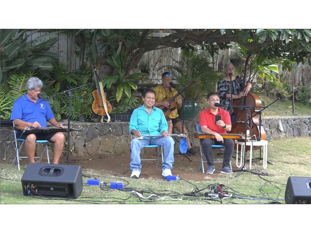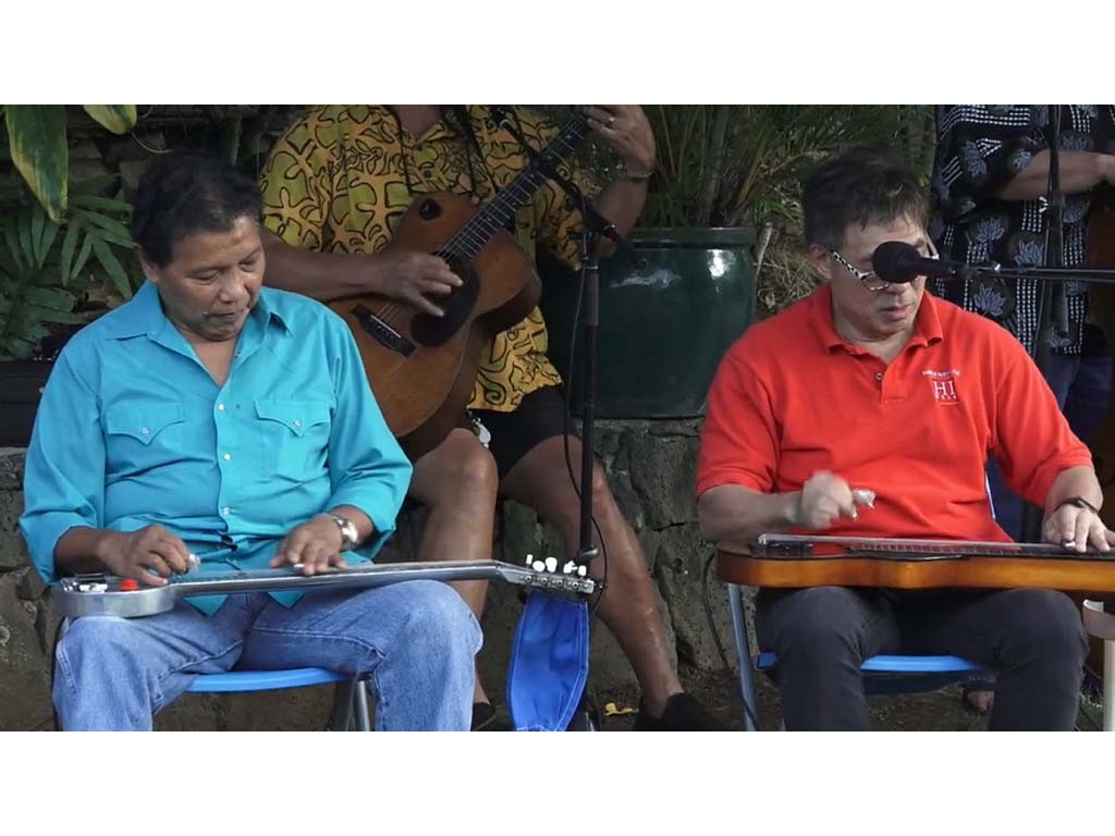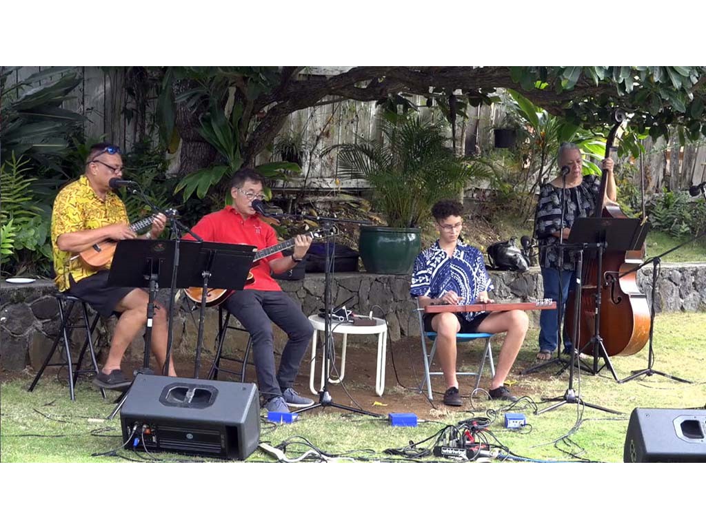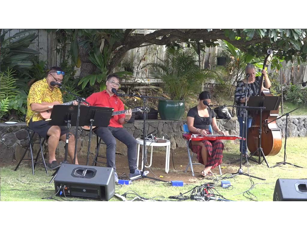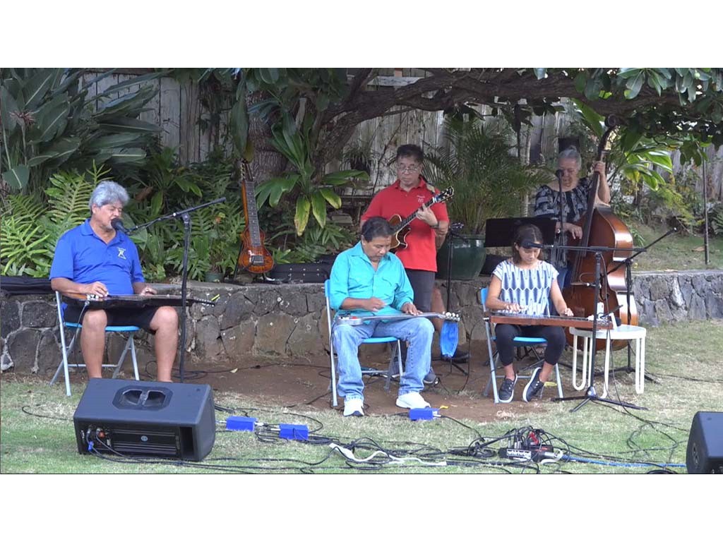 • The steel guitar kanikapila jam with Greg Sardinha, Bobby Ingano, and Alan Akaka on steel guitars with Kaipo Asing on guitar and Helene Woodward on upright bass.