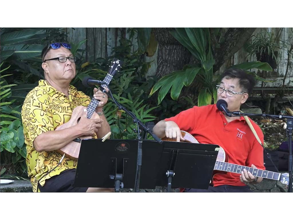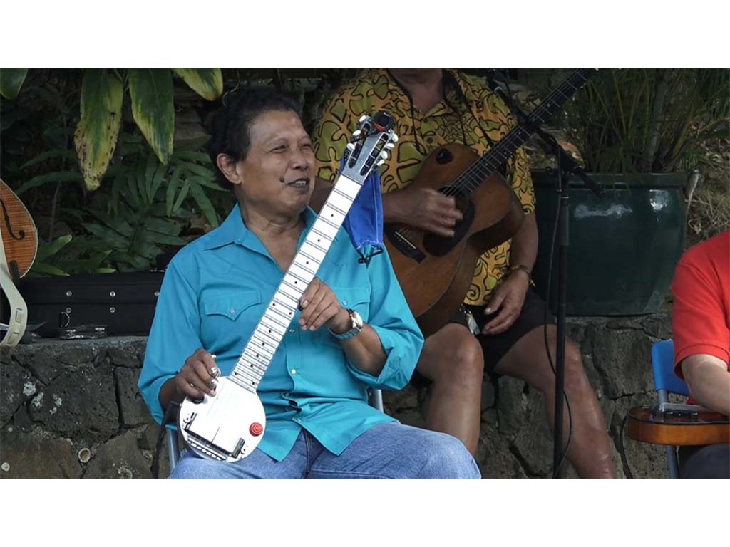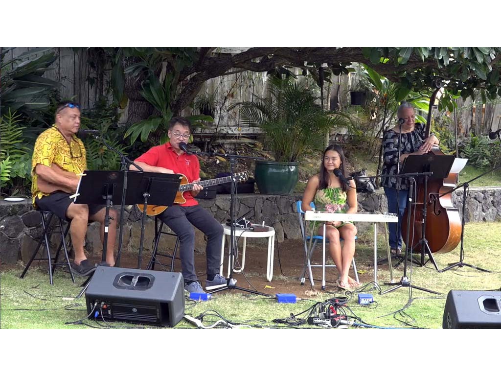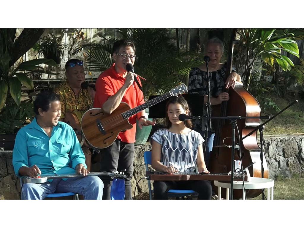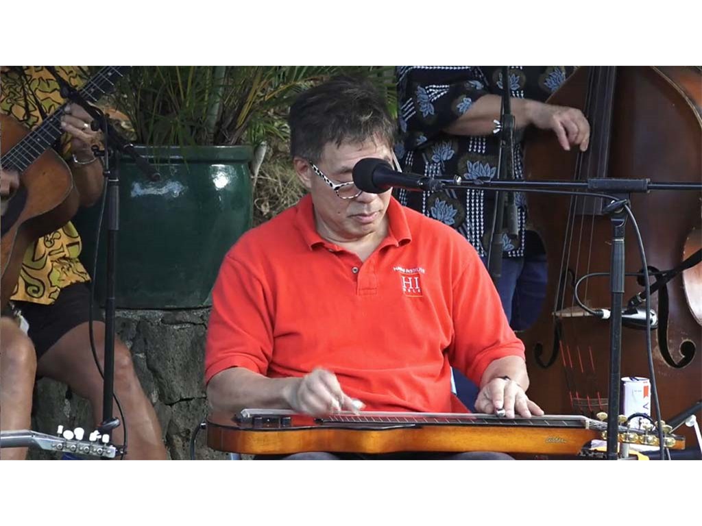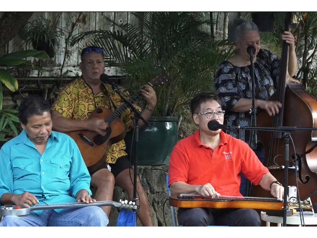 • The steel guitar kanikapila jam with Greg Sardinha, Bobby Ingano, and Alan Akaka on steel guitars with Kaipo Asing on guitar and Helene Woodward on upright bass.