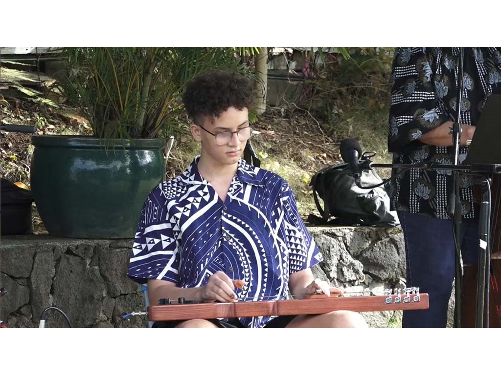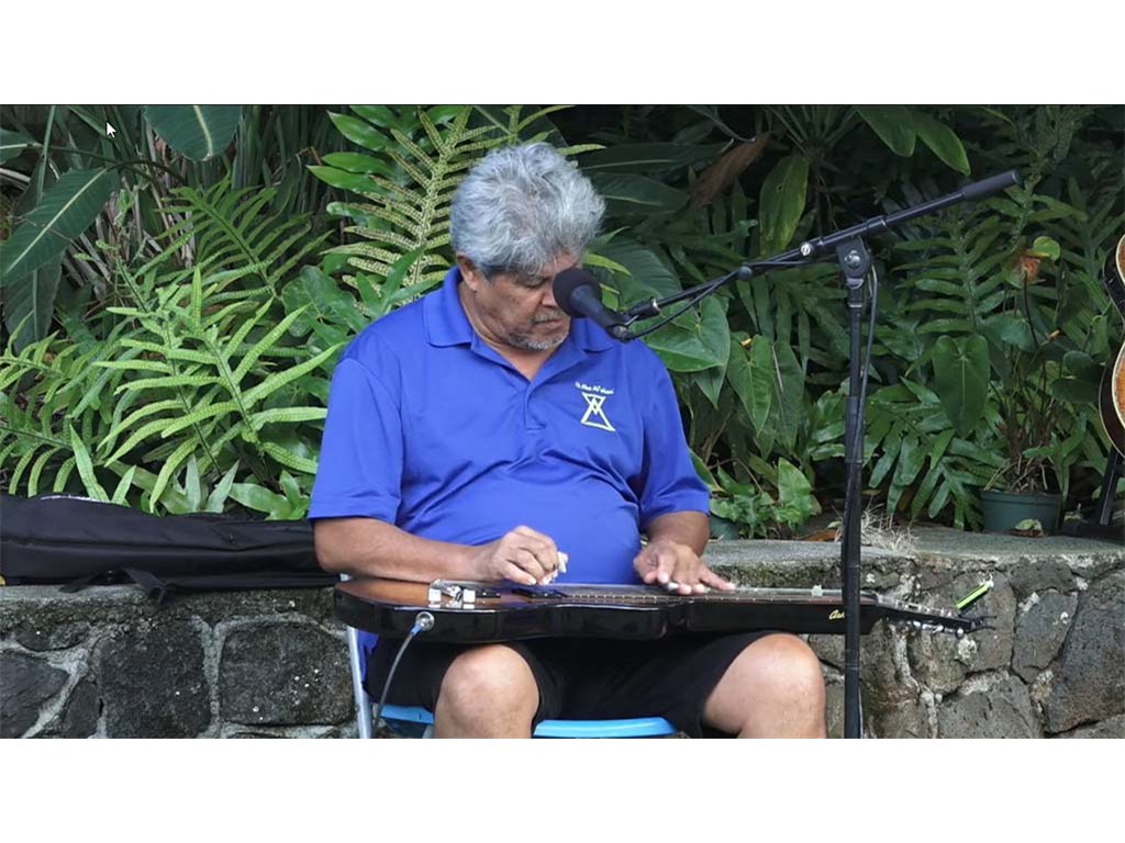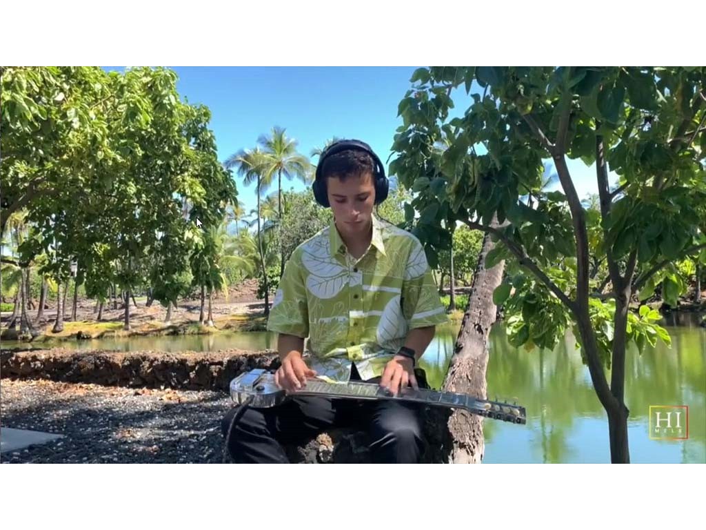 The Livestream Steel Guitar Saturday on October 16, 2021, featured live performances by NextGen Steel guitarists Enosa Lyman, Tai Misailidis, Pono Fernandez, Joey Misailidis, and Mālile Lyman with Alan Akaka on guitar, Kaipo Asing on ‘ukulele and Helene Woodward on upright bass. Prerecorded performances by NextGen steel guitarists Justin Firmeza and Ethan Goore were also included in the livestream. A steel guitar kanikapila jam session followed with Greg Sardinha, Bobby Ingano, and Alan Akaka on steel guitars, backed up by Kaipo Asing on guitar and Helene Woodward on upright bass.