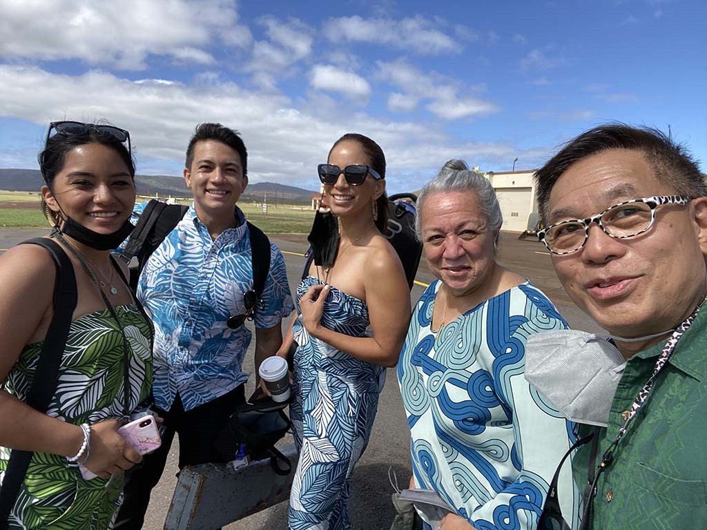 Aboard the aircraft: Alan Akaka, Mālie Lyman, Kapono Lopes, Pomaikaʻi Keawe, and Helene Woodward.