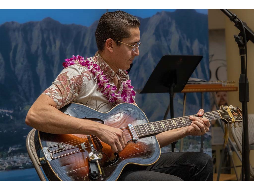 Steel guitarist Jeff Au Hoy with Helene Woodward, Joseph Zayac, and Kaipo Asing.