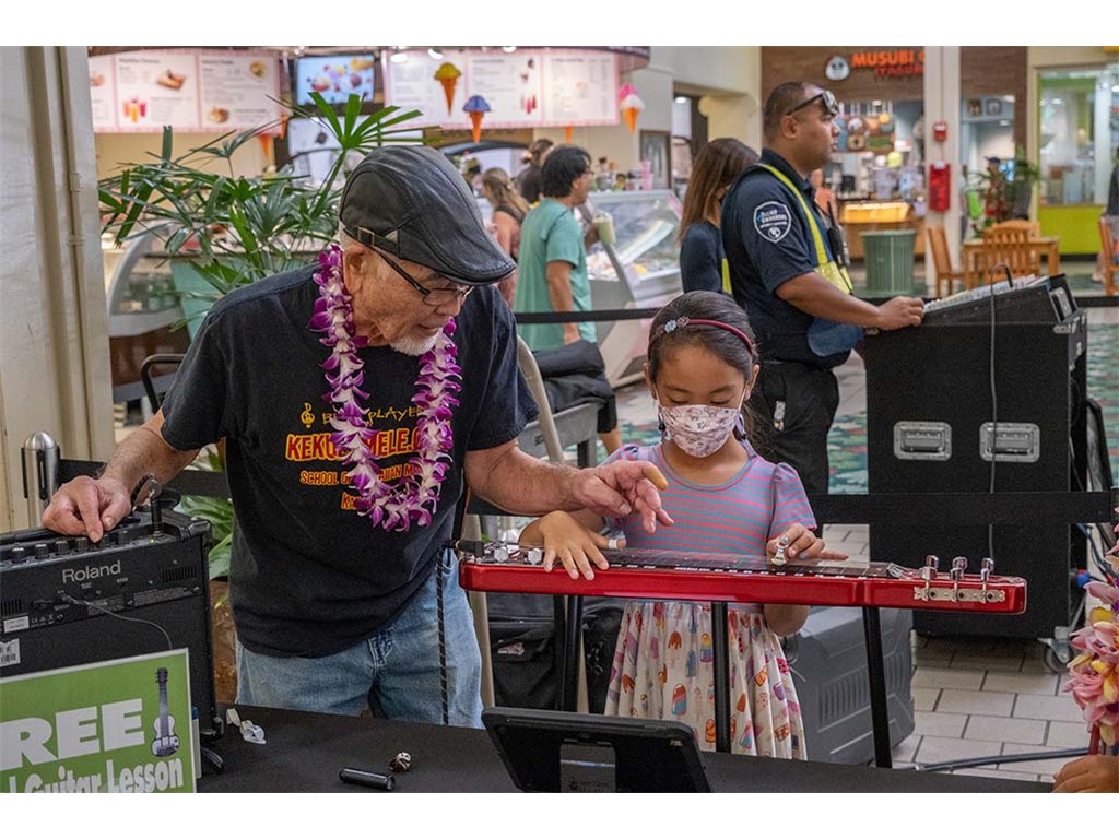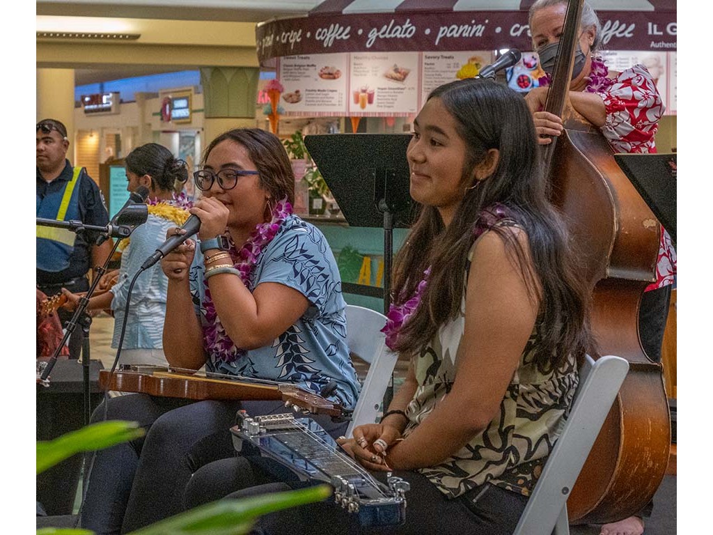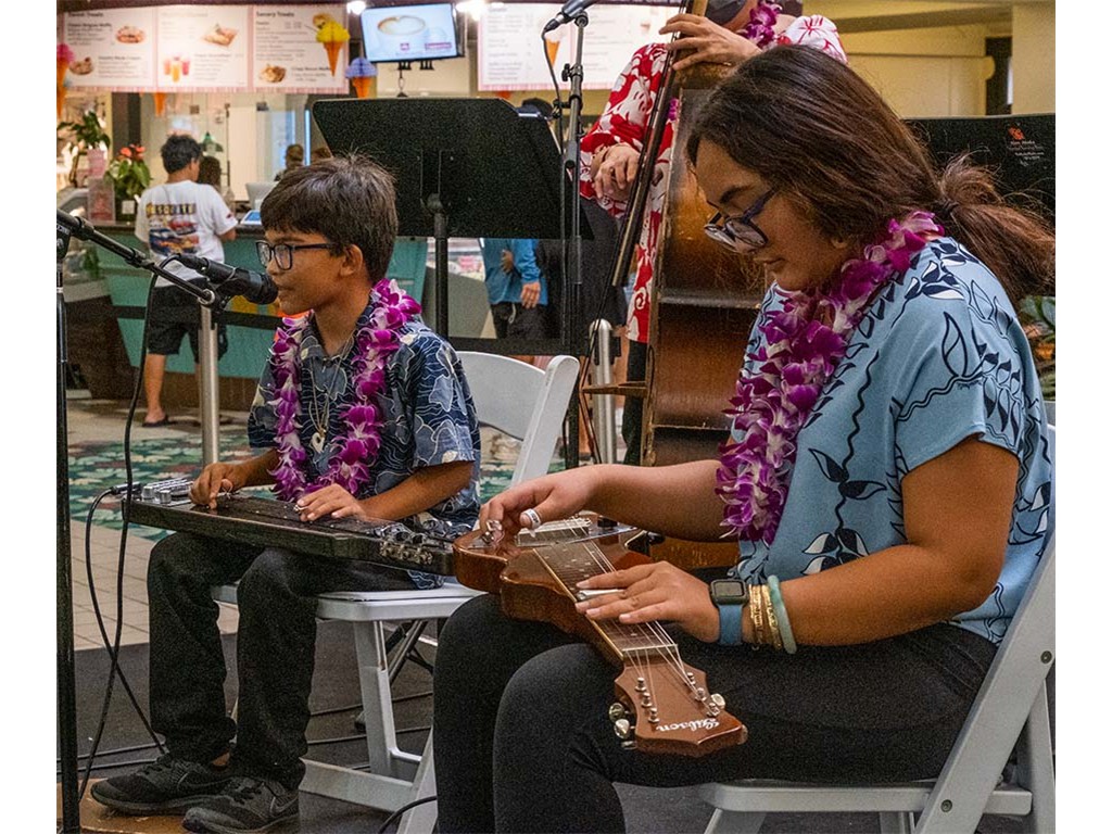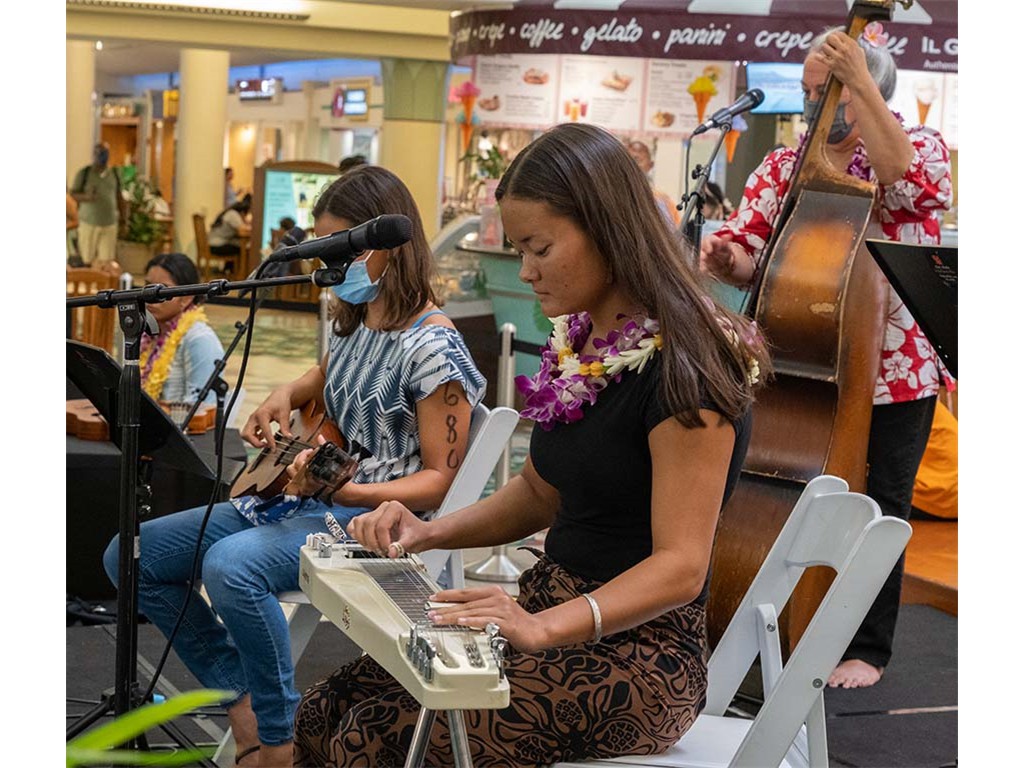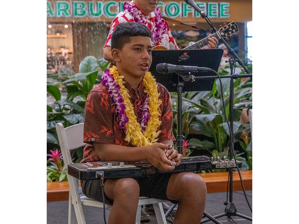 The 2022 Hawaiian Steel Guitar Festival - Keiki Kine at Kāhala Mall featured NextGen steel guitar players from Alan Akaka's Ke Kula Mele Hawai‘i School of Hawaiian Music in a two-hour performance. NextGen steel guitarists Reign Lyu, Enosa Lyman, Makamae Lyu-Napoleon, Isabella Bertelmann, Tai Misailidis, Joey Misailidis, and Malie Lyman were joined by Alan Akaka, Helene Woodward and Kaipo Asing.