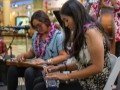 Claude Kutaka gives Reign some playing tips at the hands-on demonstration table.