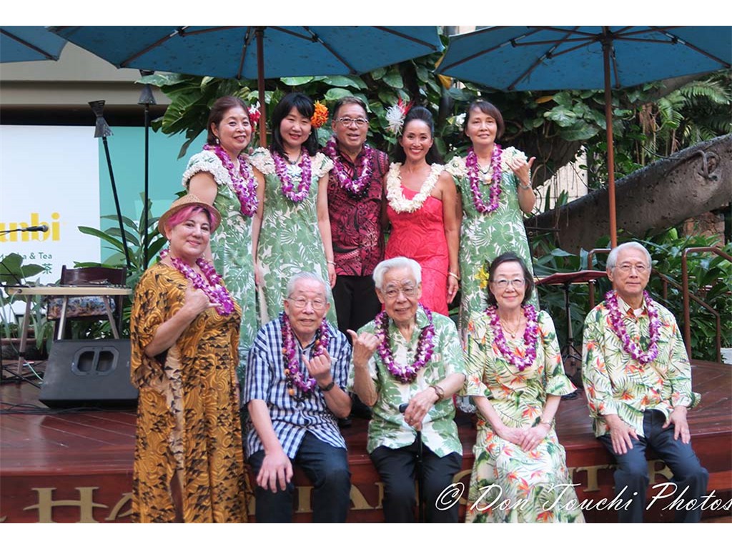 Emcee Maggie Jackson with festival musicians. Front: Matt Kobayashi, Lion Kobayashi, Noriko Tomita, Shuji Tomita. Rear: Masako Wakamatsu, Sakae Machida, Alan Akaka, Kapuanani, Haruko Ozeki.Photography by Don Touchi ©2022 by Don Touchi Photos and HIMELE.
