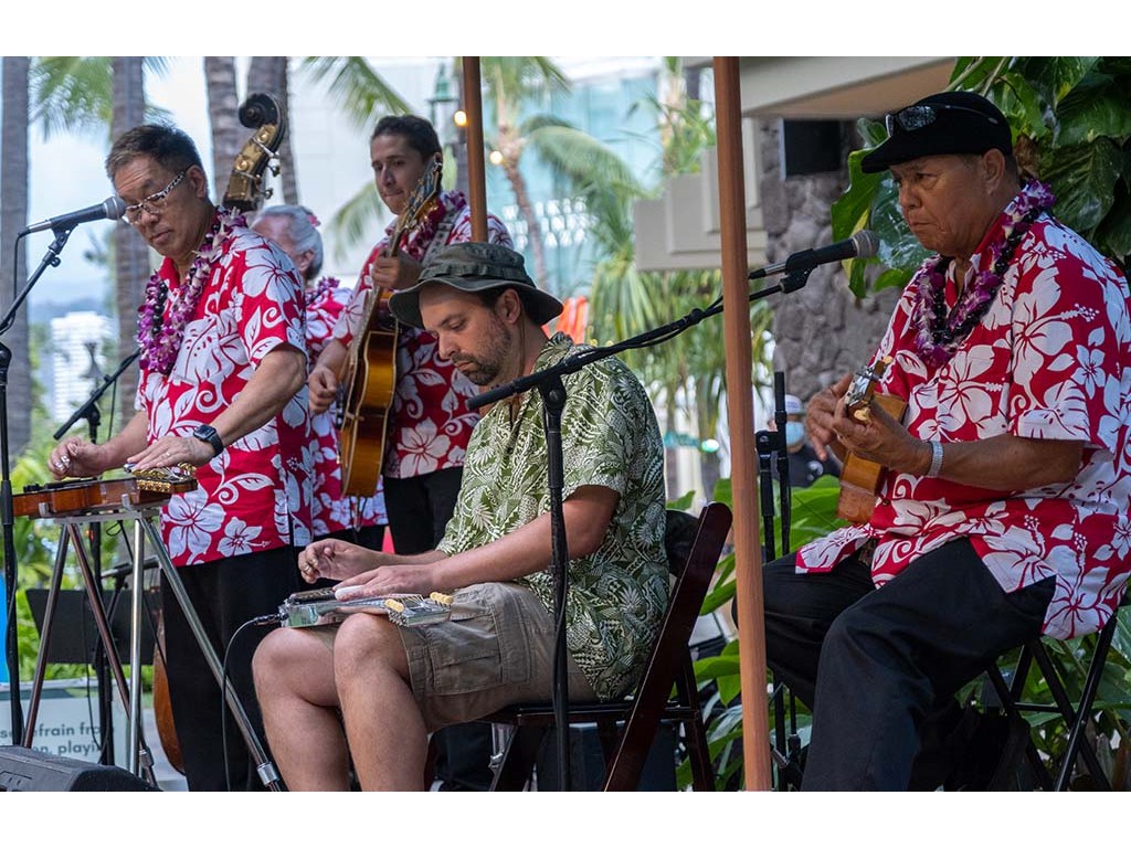 • Alan closes out the 4th Annual Waikīkī Steel Guitar Week and the 12th Annual Waikīkī Steel Guitar Festival. Also in picture: Helene Woodward, Joseph Zayac, Ethan Goore, and Kaipo Asing.