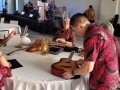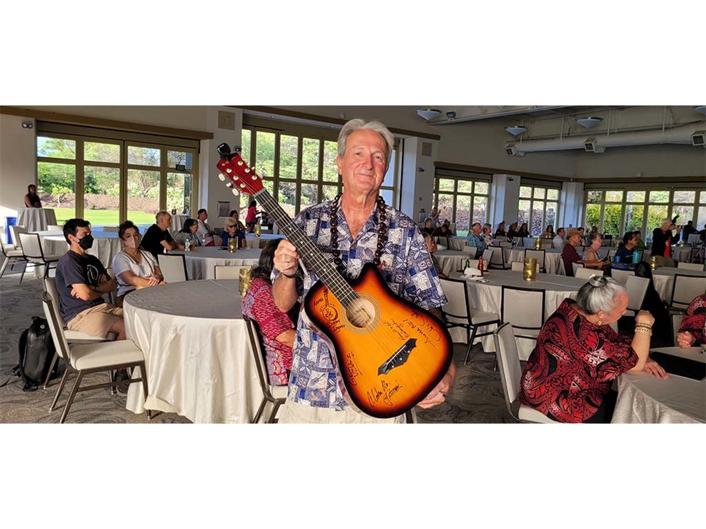 Alan Akaka affixes his signature to a steel guitar to be raffled at the concert. The steel guitar included the signatures of all the performing steel guitarists. PC-Addison Ching.