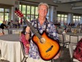 Dan Tremblay holds up the steel guitar with signatures. The guitar is a beginner acoustic electric guitar converted by Dan to be a steel guitar. PC-Addison Ching.