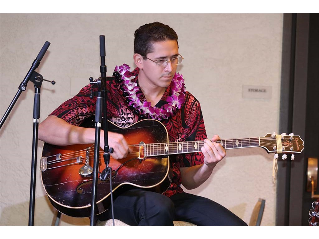 Daniel Tremblay conducted the hands-on experience and displayed an inexpensive guitar that he converted to function as a steel guitar. This guitar and the process he uses were presented at the Friday workshop, and Kapono Lopes was so impressed with the guitar that he asked to play it during his performance. The guitar, autographed by all participating musicians, was auctioned off with proceeds going to HIMELE to support its activities.