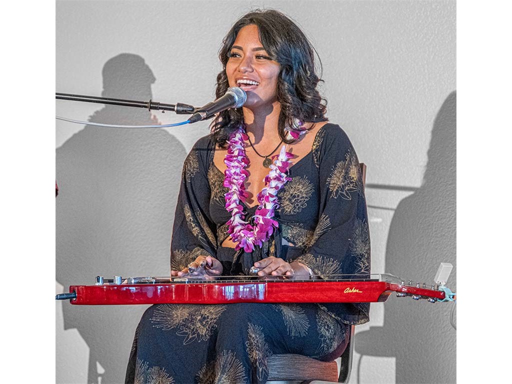 • Featured steel guitarist Mālie Lyman showing off her Asher steel guitar.