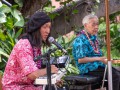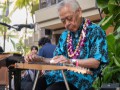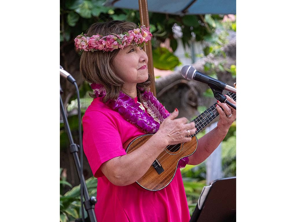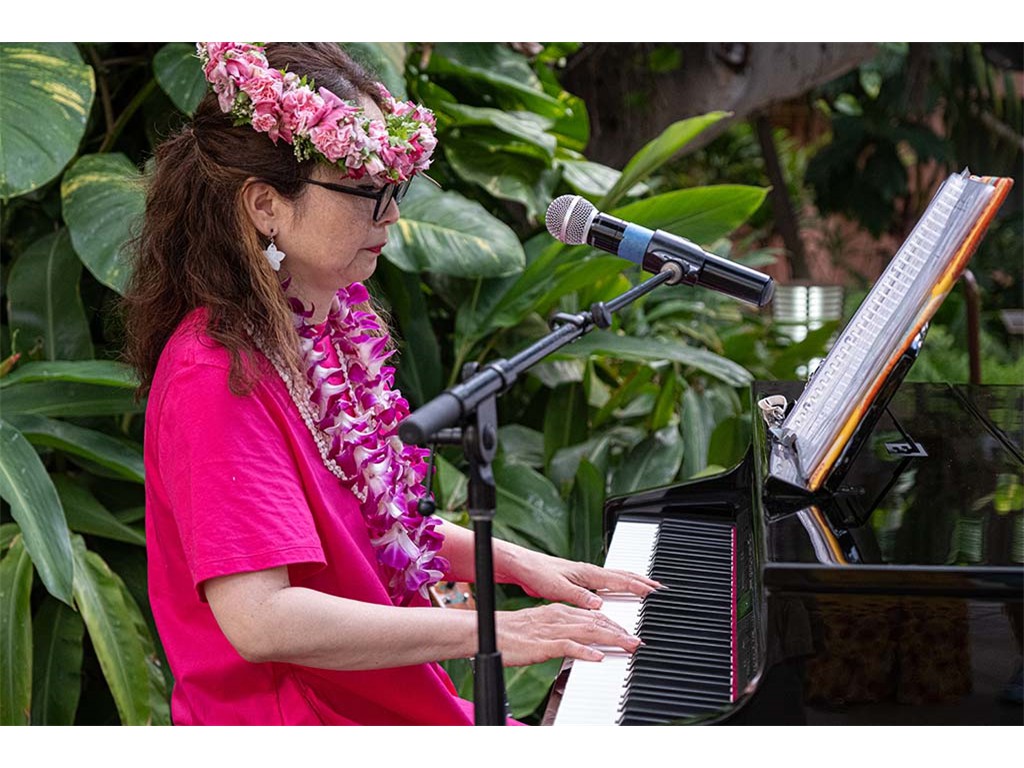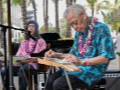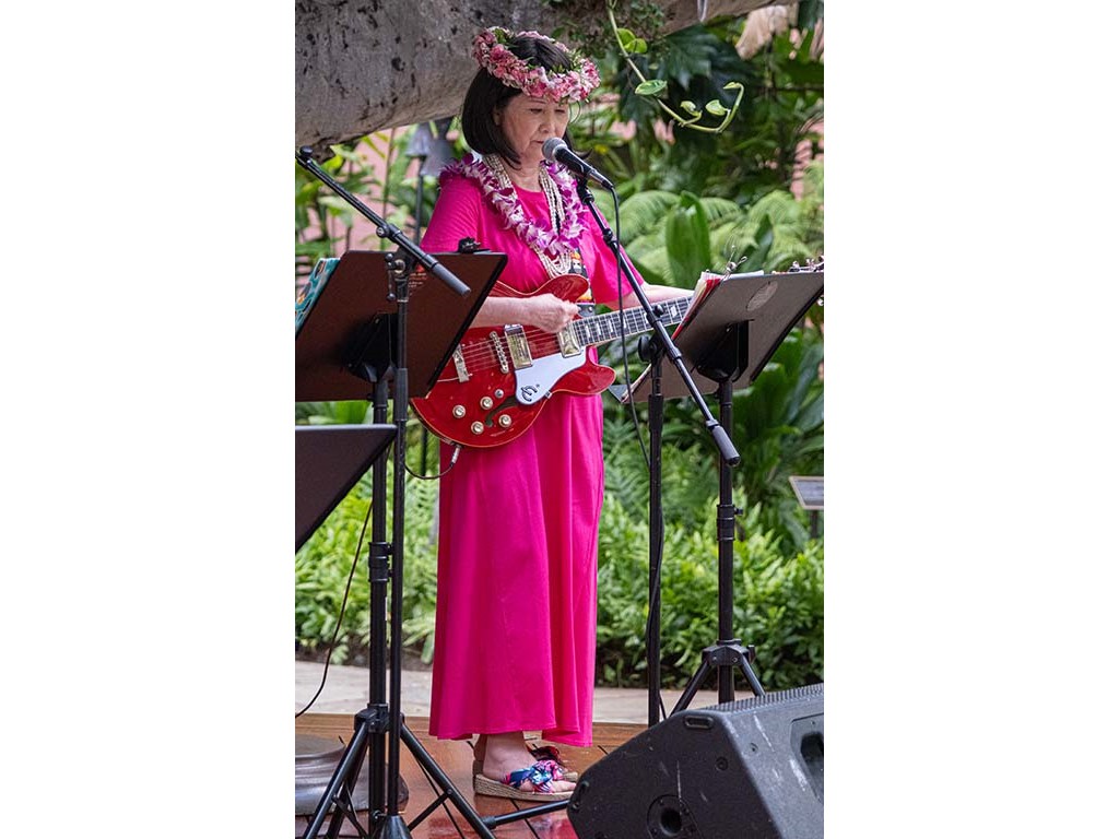• Alan Akaka stepped in as emcee for Masami Sato & Makana. From left: Masami Sato, Alan, and Ayumi Kato. Kazuko Tanaka on the steel guitar is behind Alan.