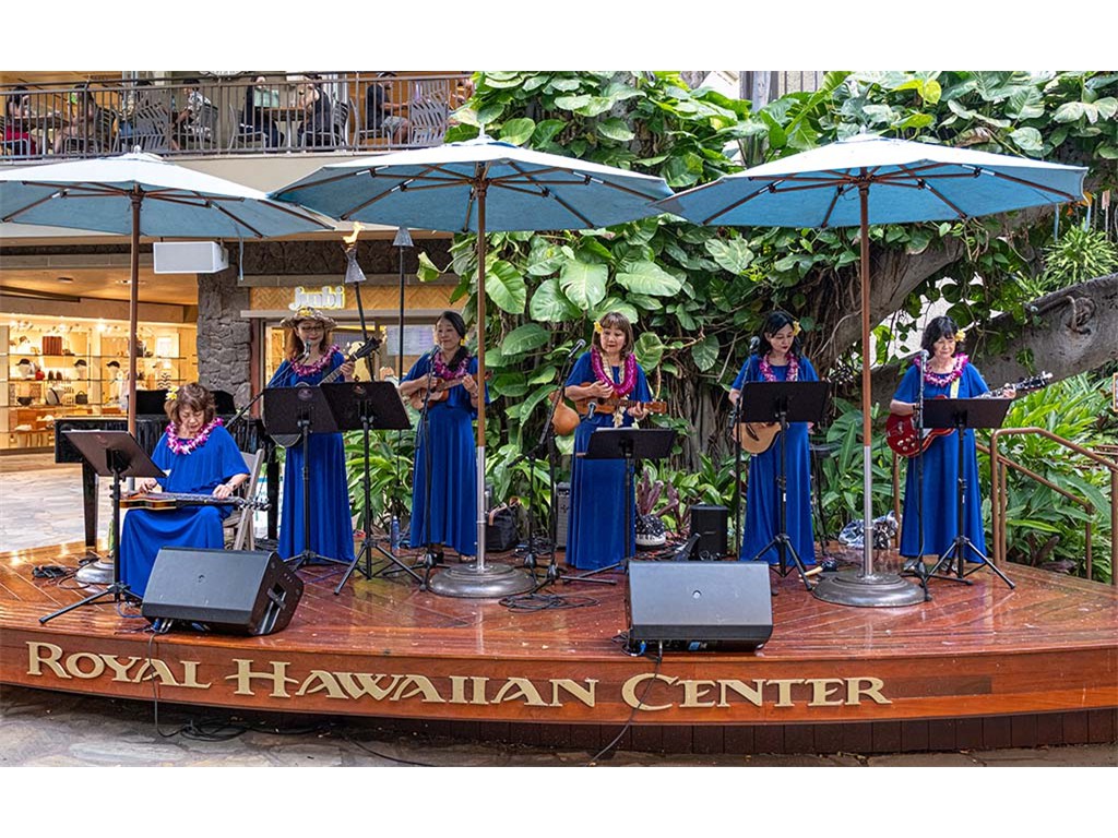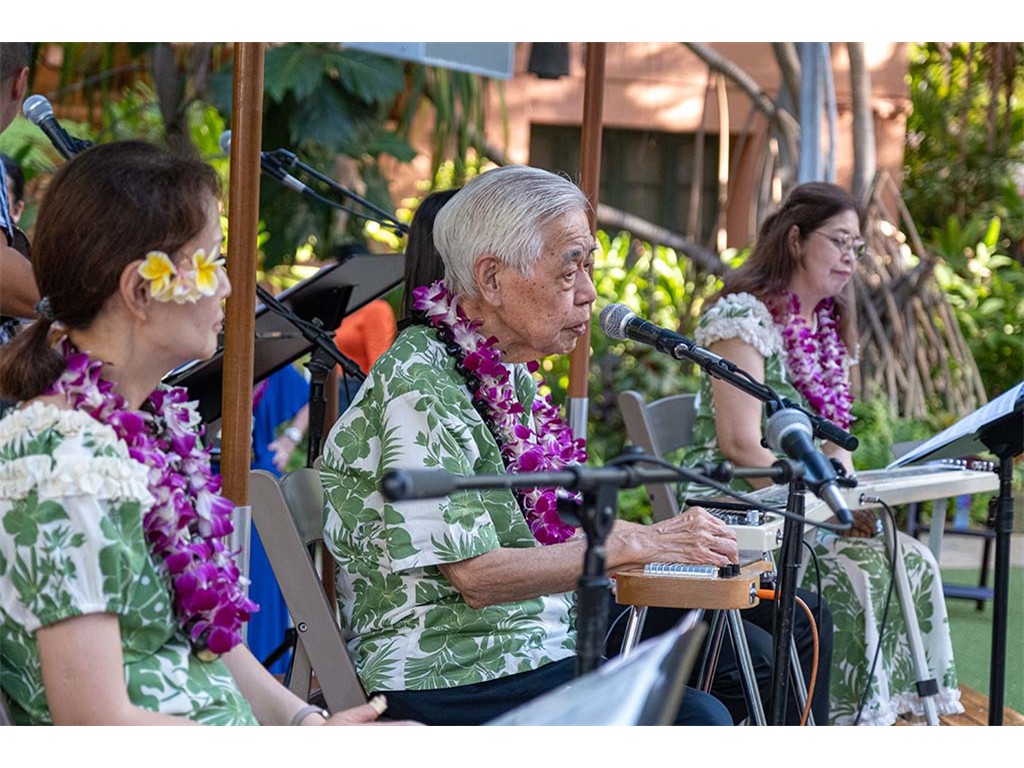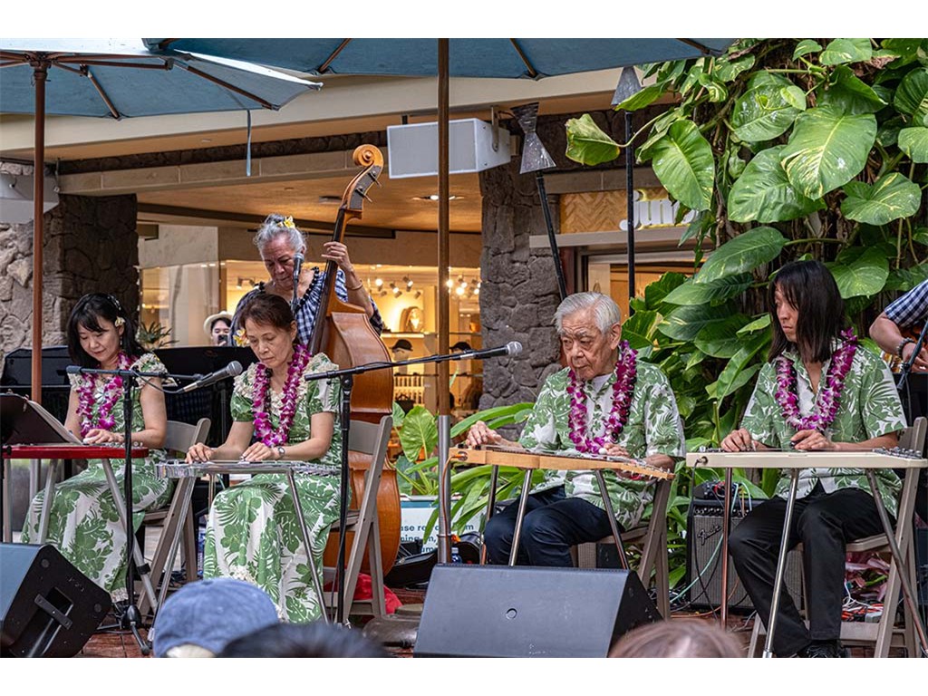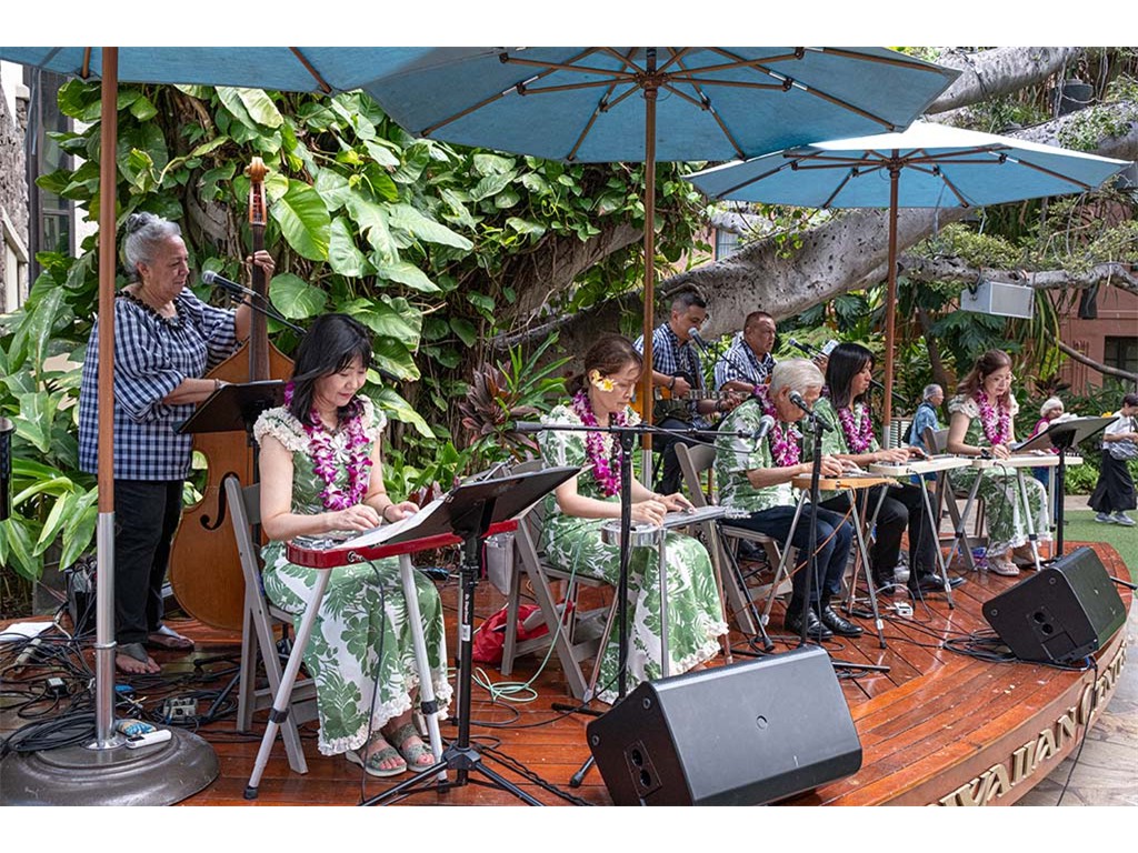 Lion Kobayashi with Steel Guitar Ensemble members Sakae Machida, Haruko Ozeki, Hajime Takahashi, and Masako Wakamatsu, accompanied by Helene Woodward, David Woodward, and Kaipo Asing.