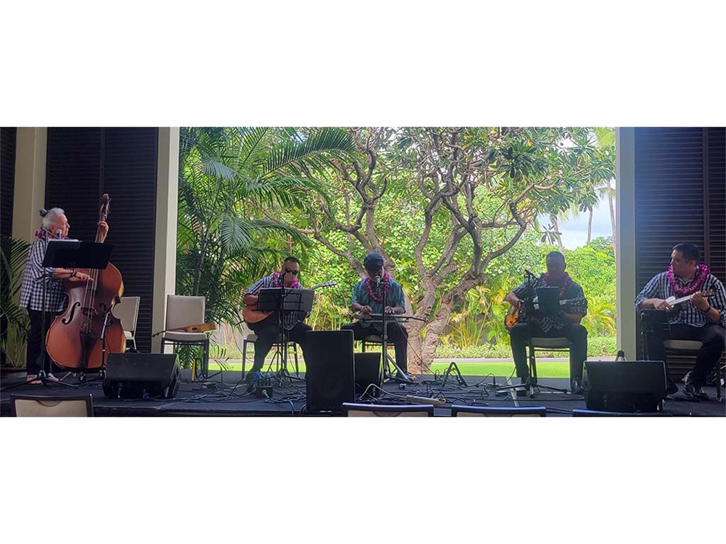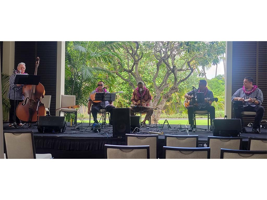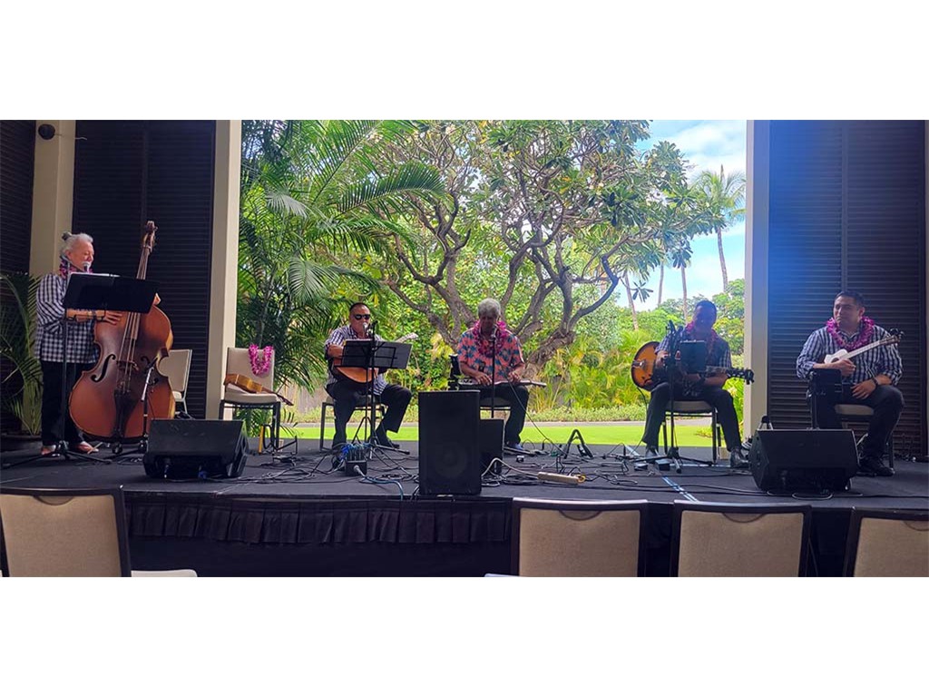 Featured steel guitarist Dwight Tokumoto with Helene Woodward, Kaipo Asing, David Woodward, and Kaipo Lindsey.