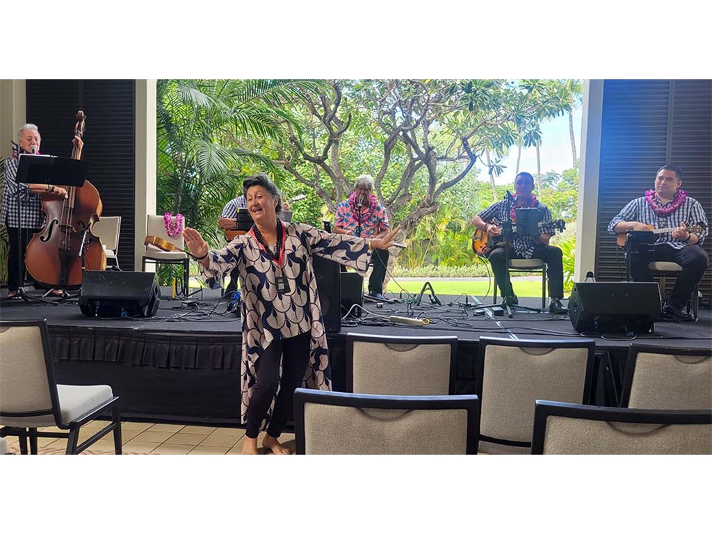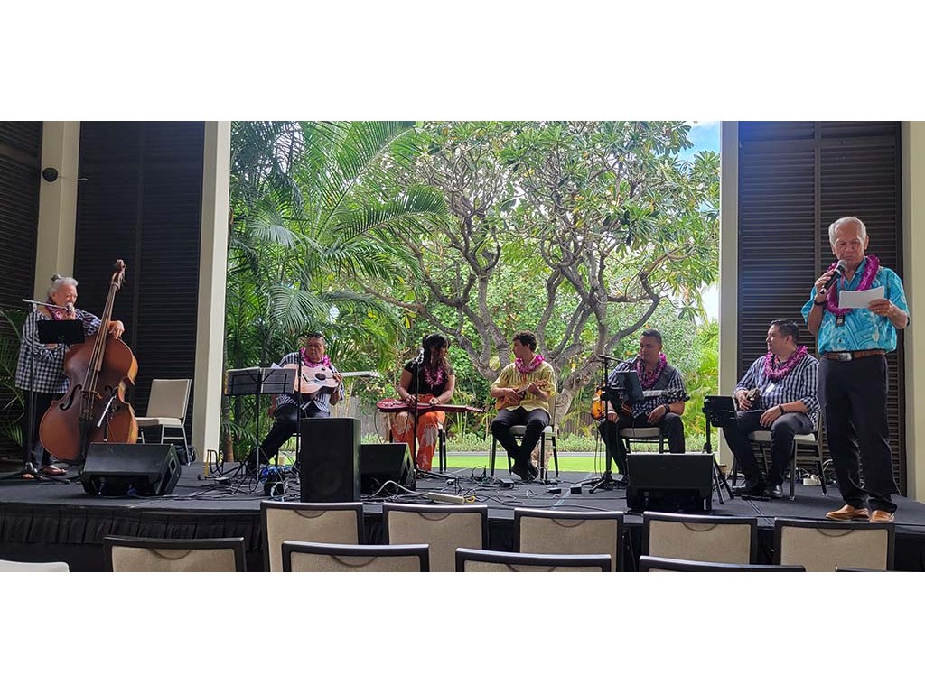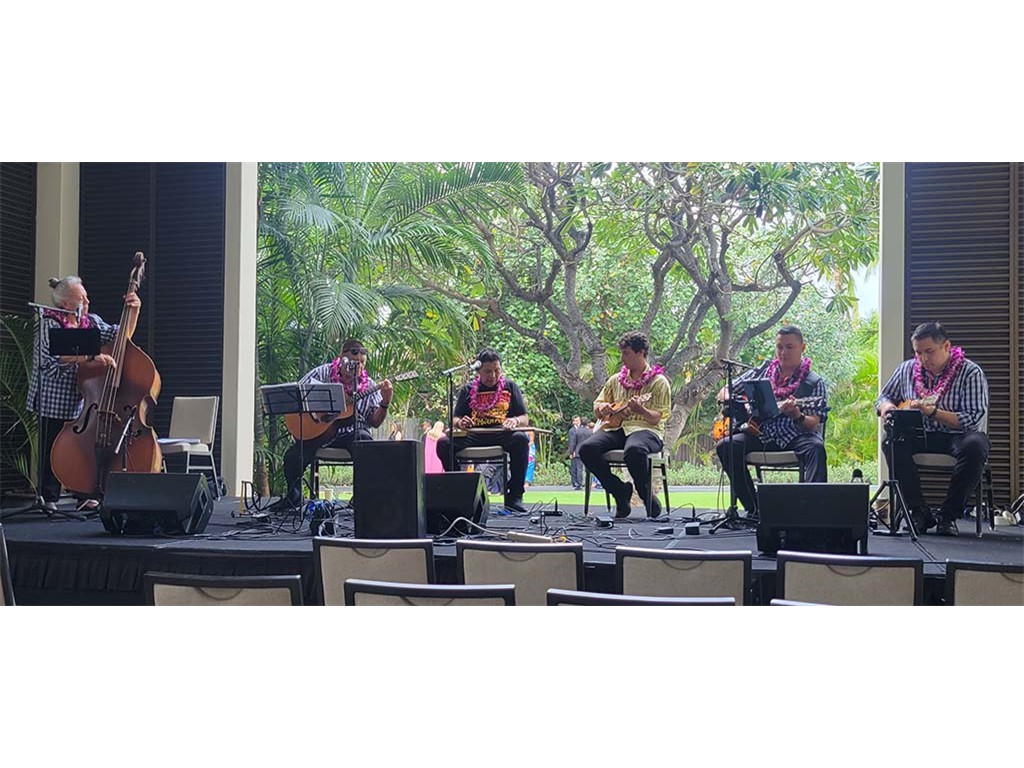 Featured steel guitarist Mālie Lyman with Helene Woodward, Kaipo Asing, Ethan Goore, David Woodward, Kaipo Lindsey, and Kimo Kahoano.