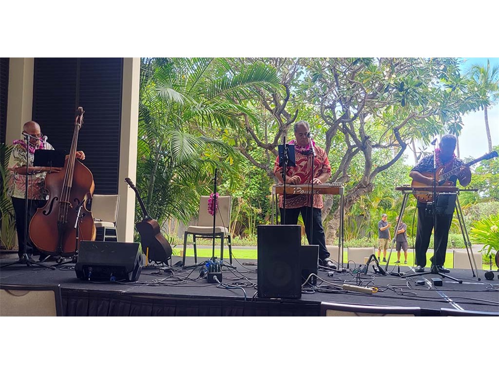Featured steel guitarist Pomaikaʻi Brown with Russell Paio and Reginald Davis.