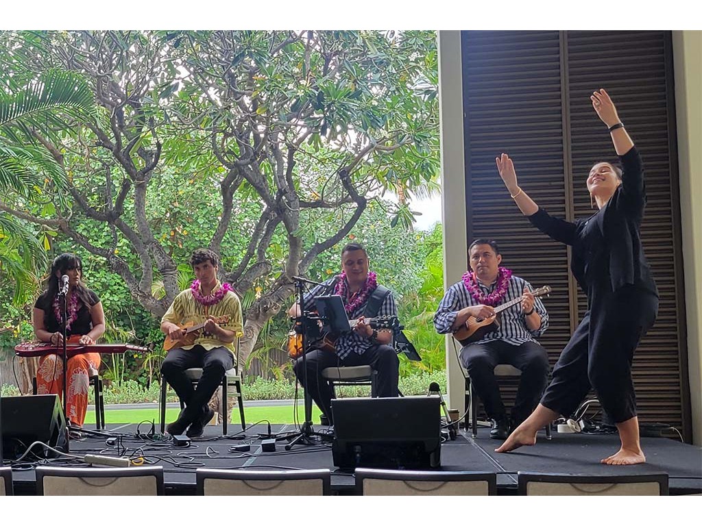 Kapuanalani shares a hula with Mālie Lyman, Ethan Goore, David Woodward, and Kaipo Lindsey.