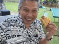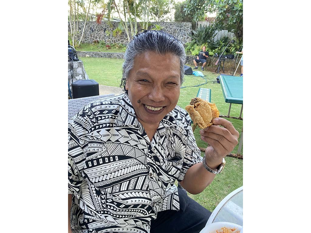 Bobby Ingano enjoying a bite of fried chicken. Photo by Alan Akaka.