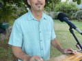 Featured steel guitarist Pauil Kim. Note the carving detail on Pauil's steel, his personal trademark. Photo by Alan Akaka.