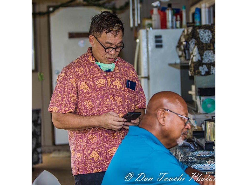 Alan Akaka checks his phone for Livestream comments.