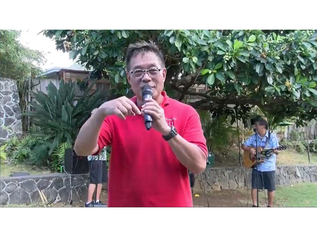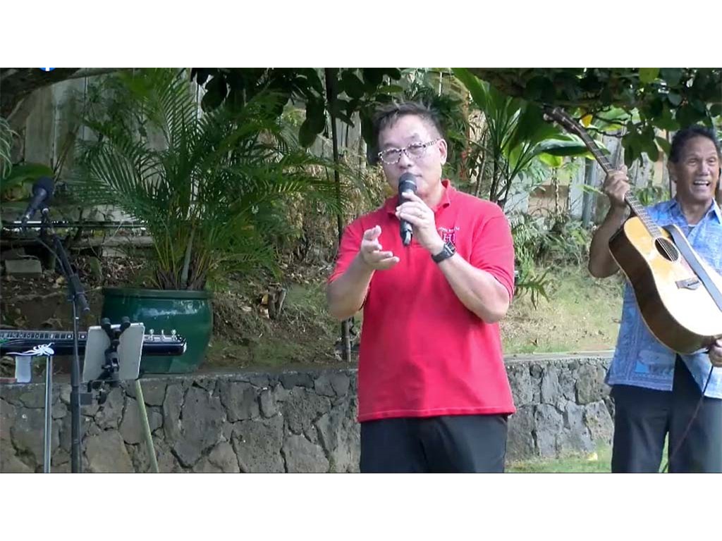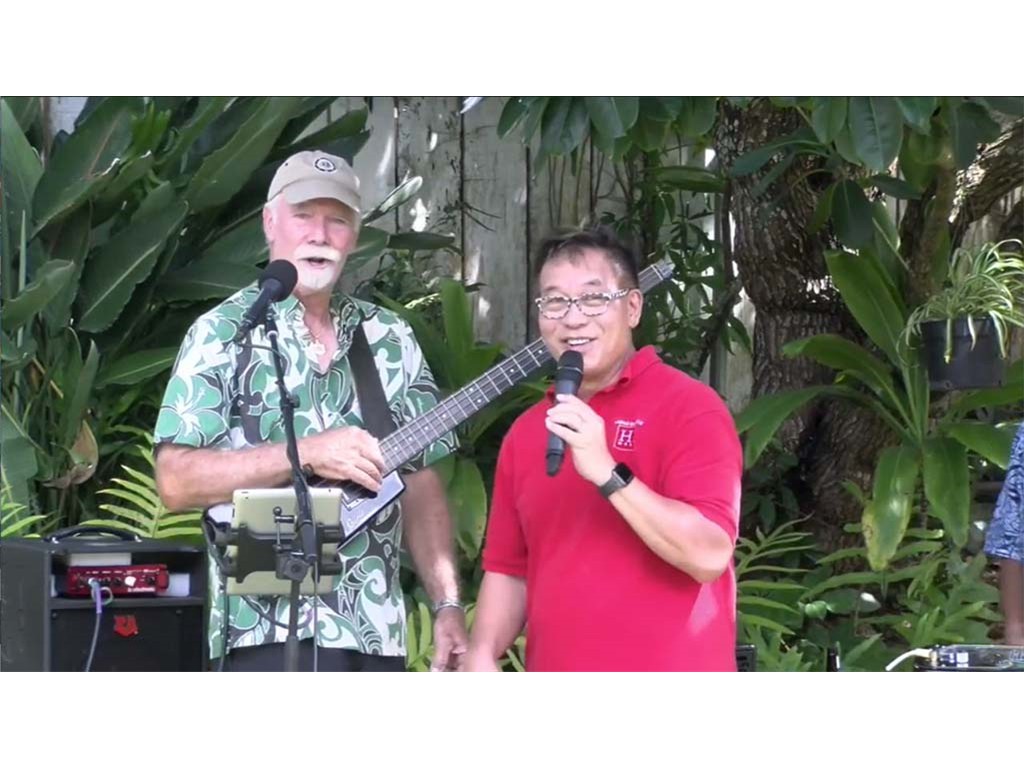 Emcee Alan Akaka announcing future livestream showcases on Kauaʻi and Maui.