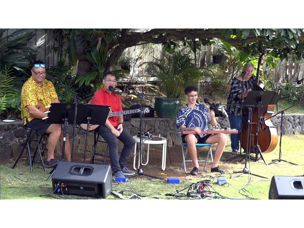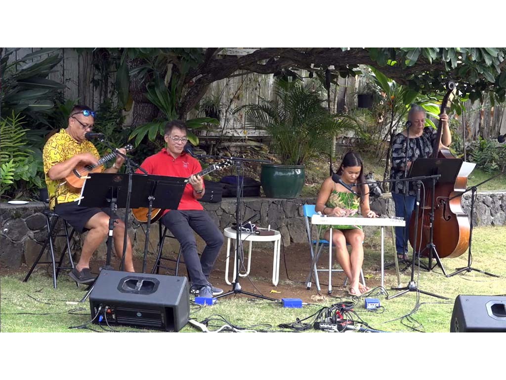 • The steel guitar kanikapila jam with Greg Sardinha, Bobby Ingano, and Alan Akaka on steel guitars with Kaipo Asing on guitar and Helene Woodward on upright bass.
