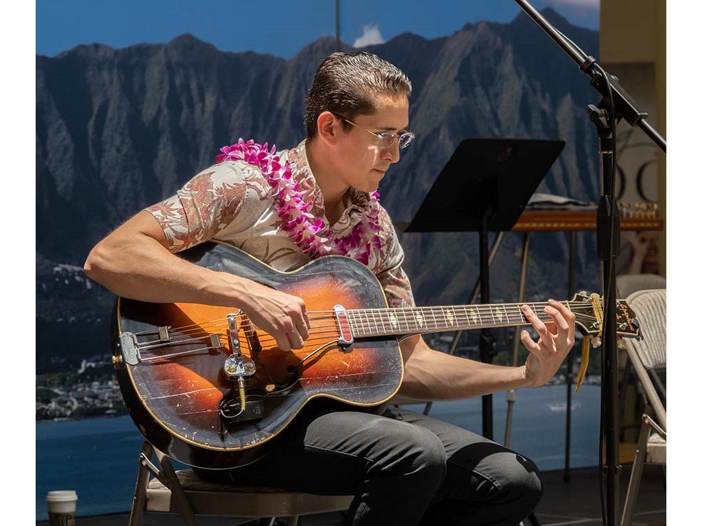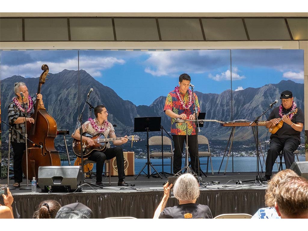 Steel guitarist Jeff Au Hoy with Helene Woodward, Joseph Zayac, and Kaipo Asing.