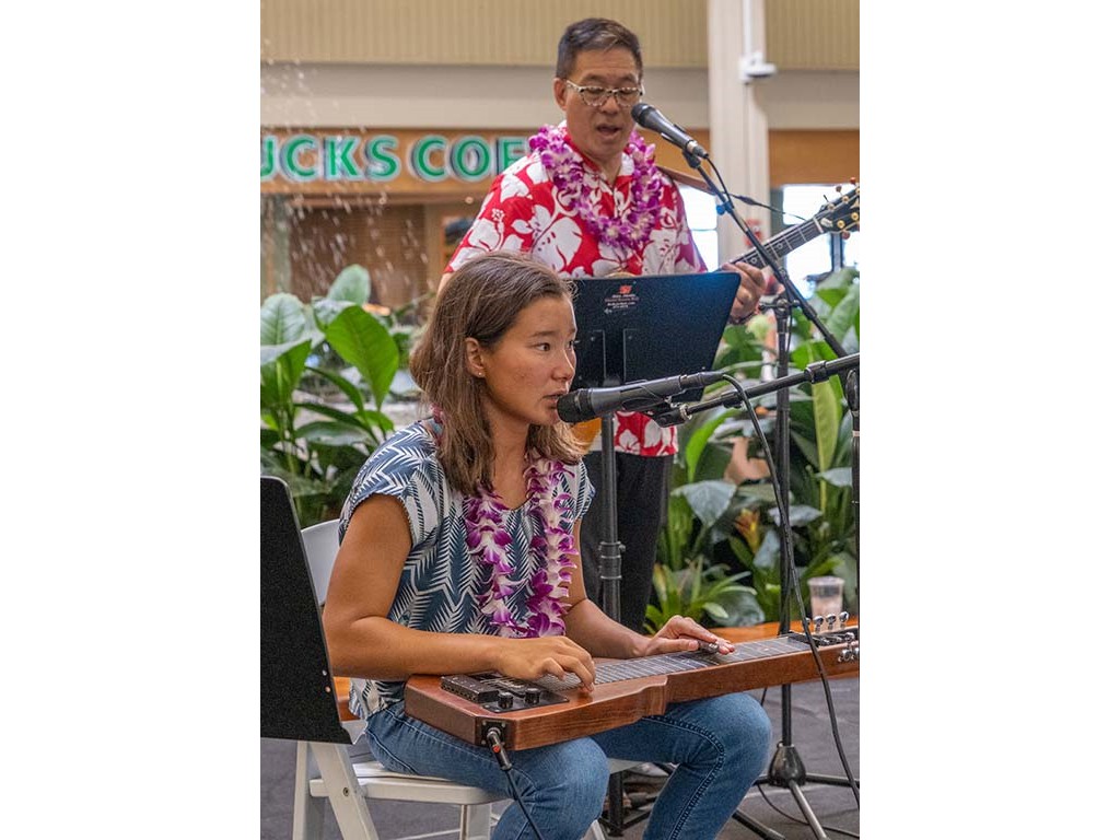 Guest vocalist Pomaikaʻi Keawe sang while daighter Mālie played the steel guitar. Helene and Alan provide backup.