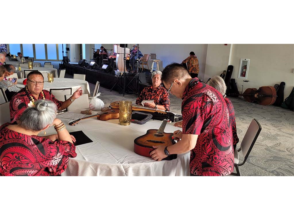Alan Akaka affixes his signature to a steel guitar to be raffled at the concert. The steel guitar included the signatures of all the performing steel guitarists. PC-Addison Ching.