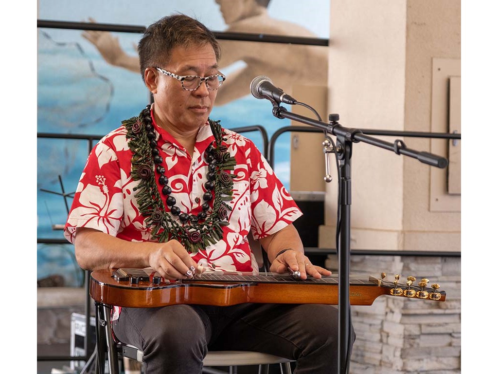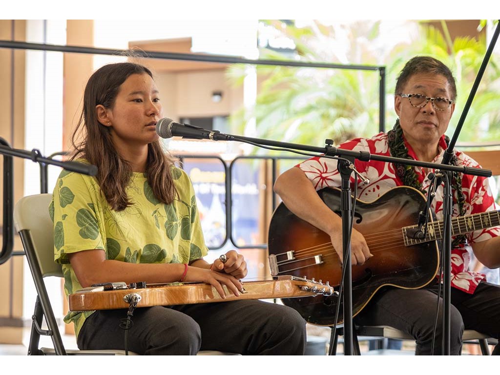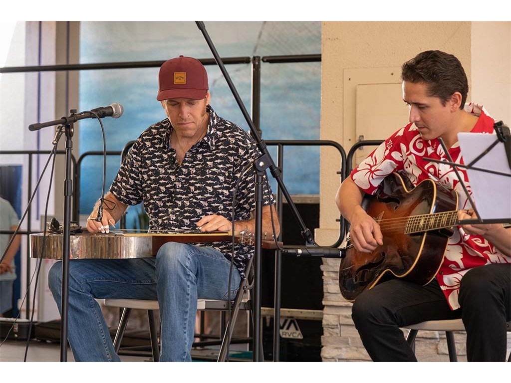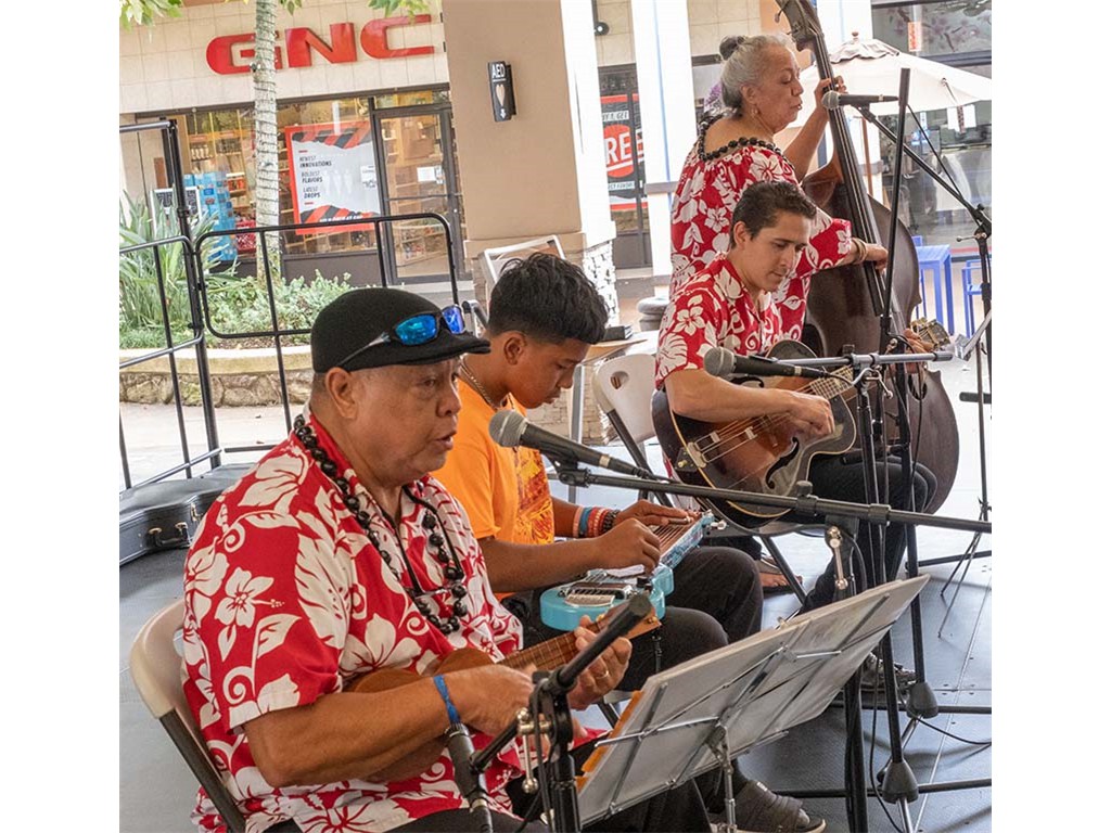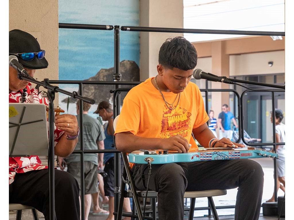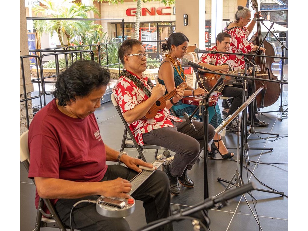 The Kukui Grove Center festival featured steel guitarists Geronimo "Geri" Valdriz, Greg Sardinha, NextGen steel guitarists Makamae Lyu-Napoleon, Isabella Bertlemann, Enosa Lyman, Tai Misailidis and Joey Misailidis, steel guitarists Sebastian Mūller, Mālie Lyman, Bobby Ingano with guest artist Heu‘i Bandmann, and Alan Akaka.