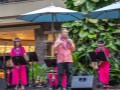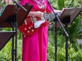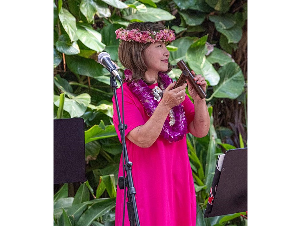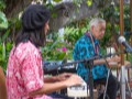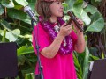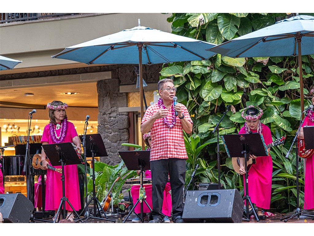• Alan Akaka stepped in as emcee for Masami Sato & Makana. From left: Masami Sato, Alan, and Ayumi Kato. Kazuko Tanaka on the steel guitar is behind Alan.
