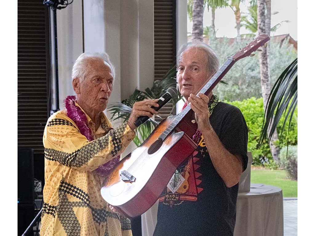Kimo with Daniel Tremblay and the guitar converted by Dan to be an acoustic steel guitar. Autographed by all festival musicians, the guitar will be auctioned off with proceeds going to HIMELE.