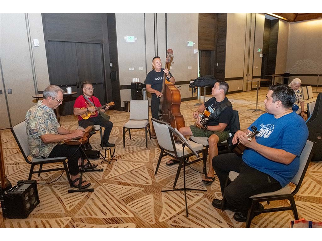 Last-minute fine tuning with Konabob Stoffer and backup musicians Alan Akaka, Kaipo Asing, David Woodward, and Kaipo Lindsey.