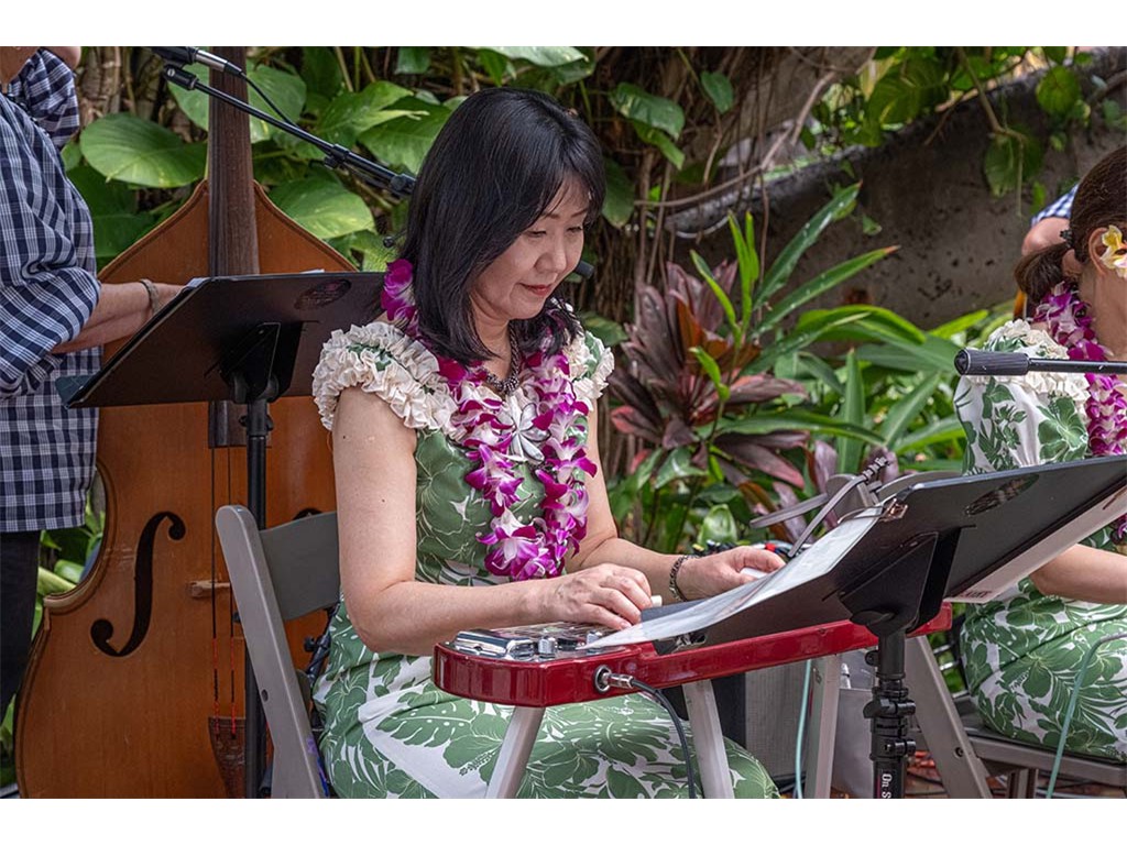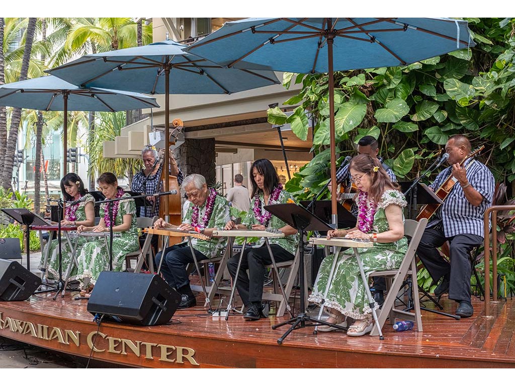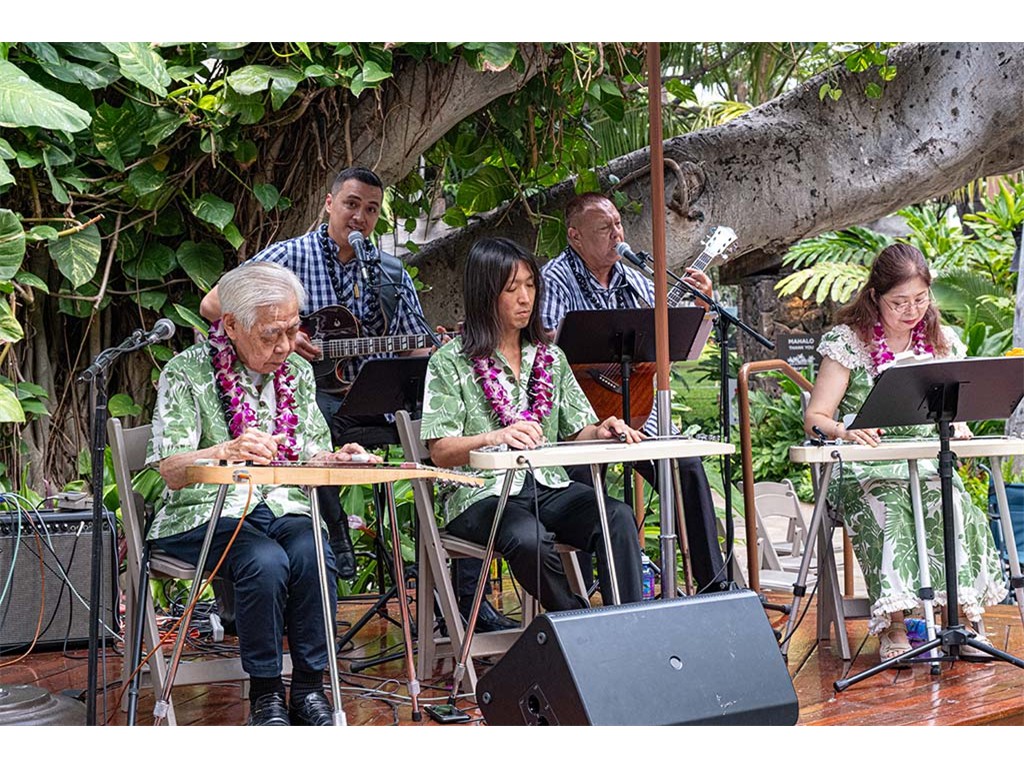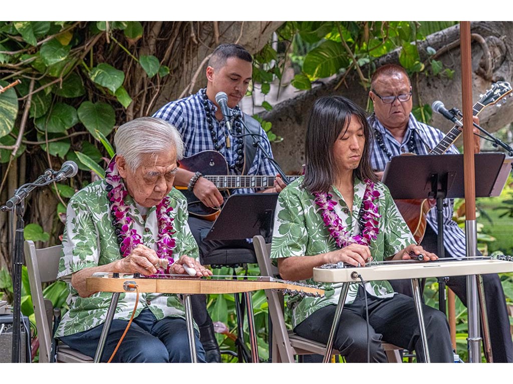 Lion Kobayashi with Steel Guitar Ensemble members Sakae Machida, Haruko Ozeki, Hajime Takahashi, and Masako Wakamatsu, accompanied by Helene Woodward, David Woodward, and Kaipo Asing.