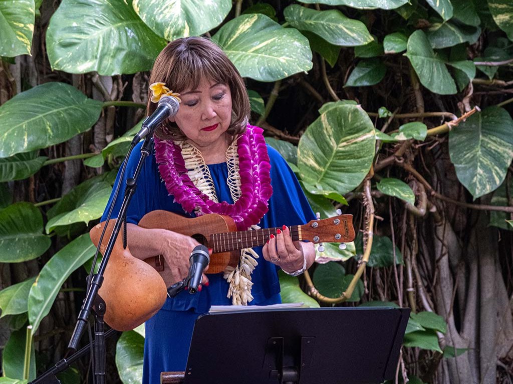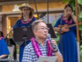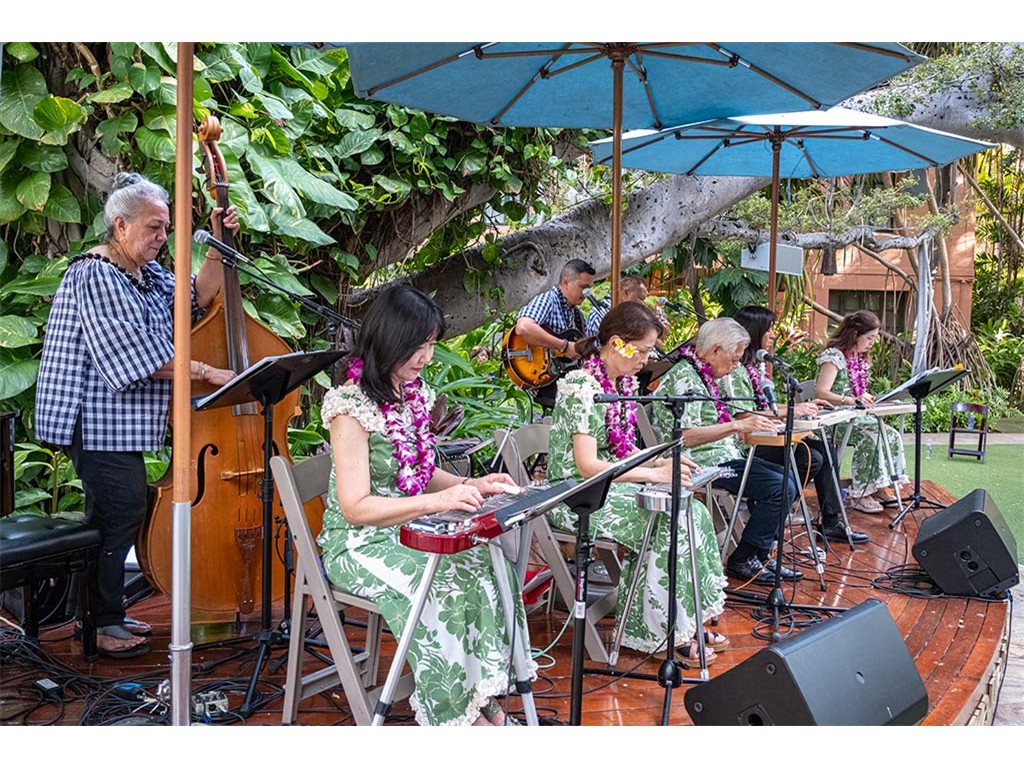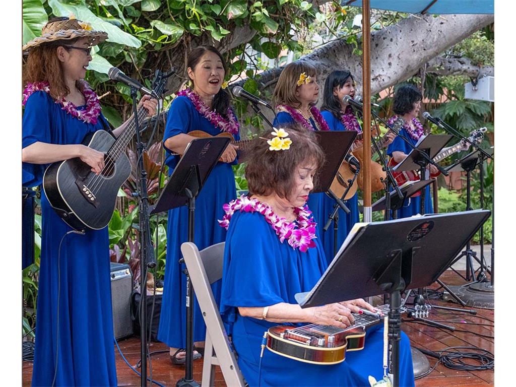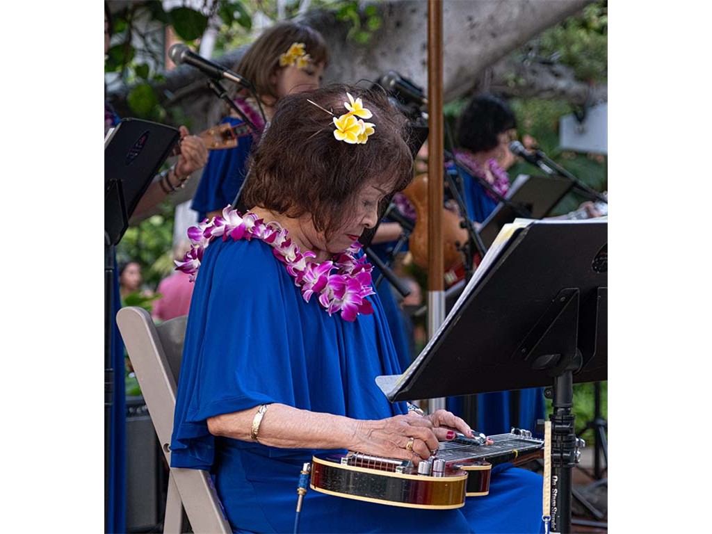 Lion Kobayashi with Steel Guitar Ensemble members Sakae Machida, Haruko Ozeki, Hajime Takahashi, and Masako Wakamatsu, accompanied by Helene Woodward, David Woodward, and Kaipo Asing.