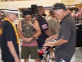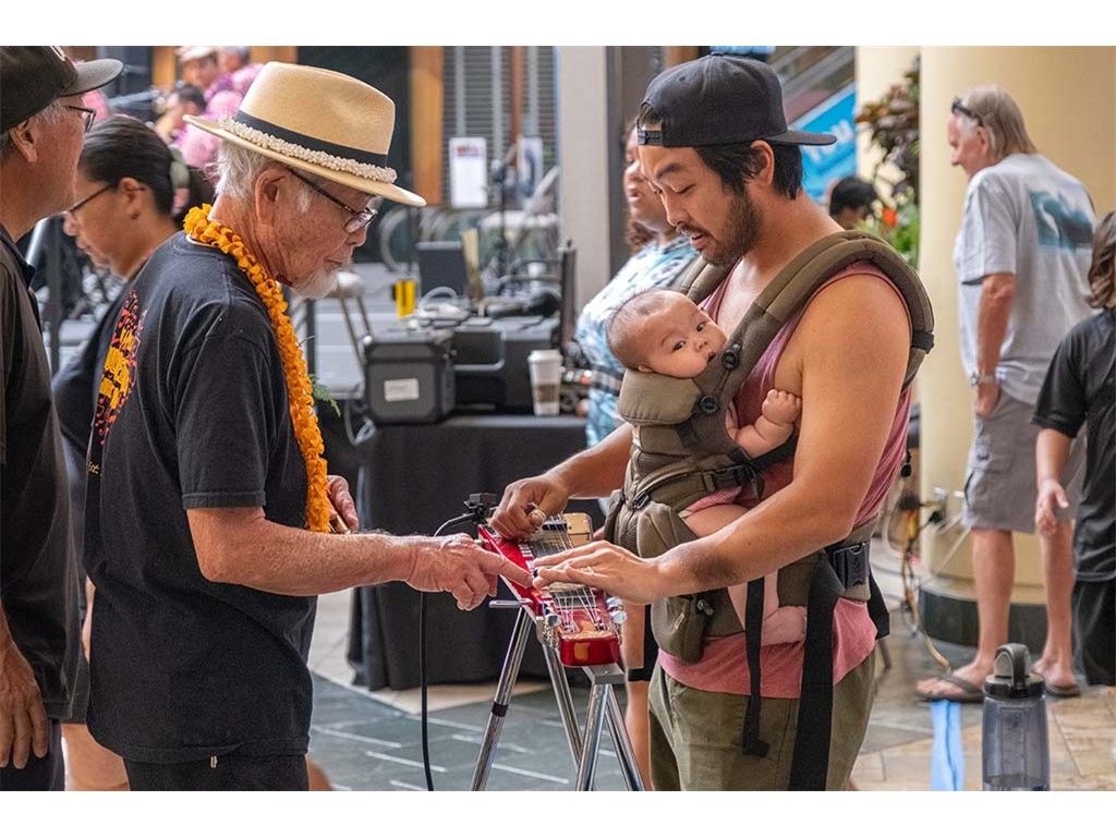 Claude Kutaka shows a festival guest steel guitar basics.