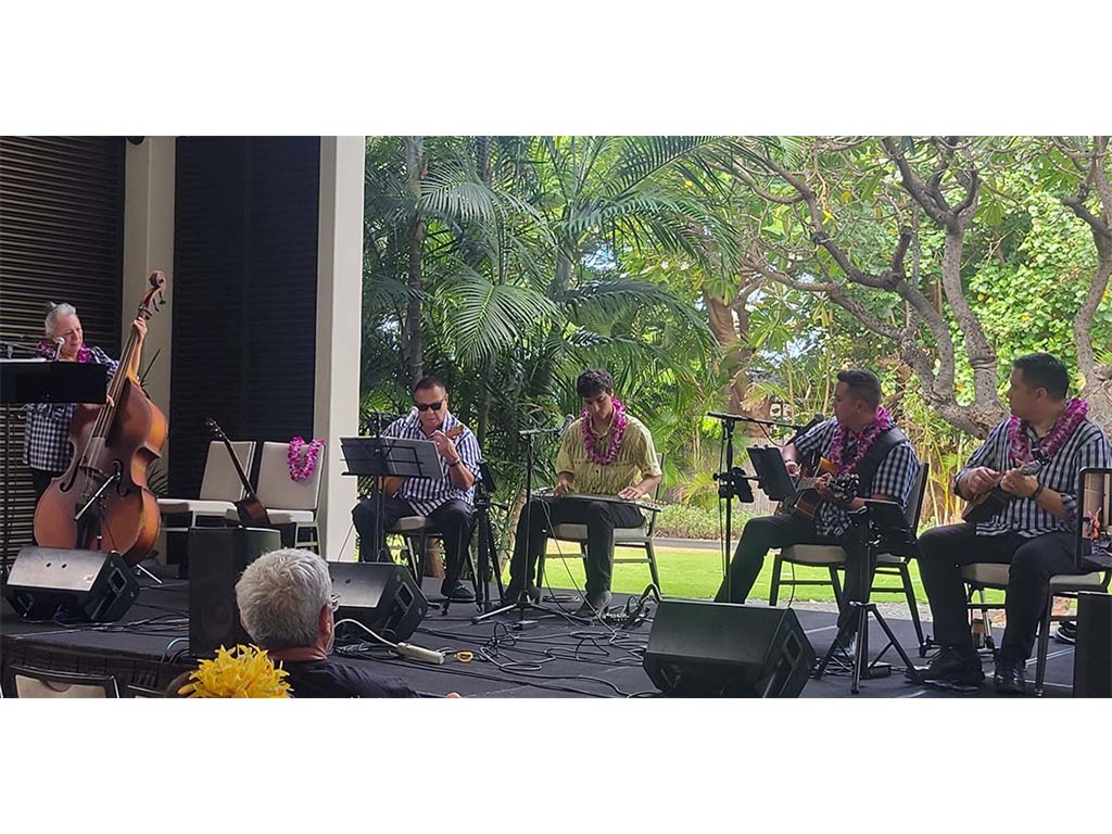 Featured steel guitarist Dwight Tokumoto with Helene Woodward, Kaipo Asing, David Woodward, and Kaipo Lindsey.