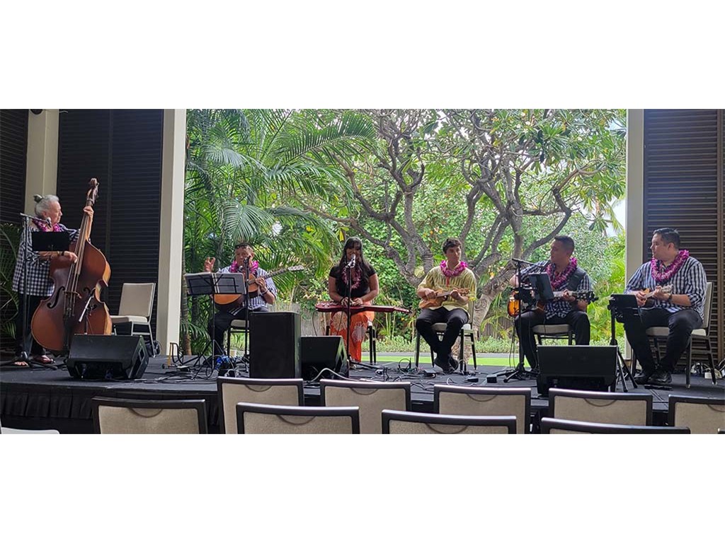 Featured steel guitarist Mālie Lyman with Helene Woodward, Kaipo Asing, Ethan Goore, David Woodward, Kaipo Lindsey, and Kimo Kahoano.